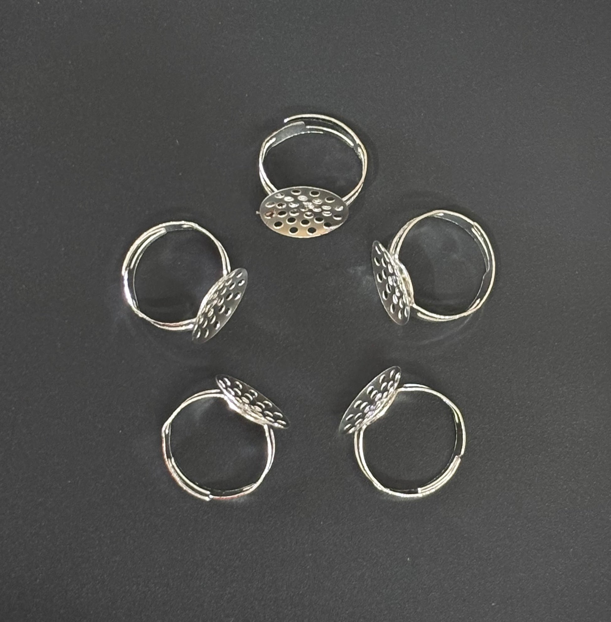 Craft custom rings with ease using these adjustable silver finger ring bases. Perfect for attaching beads, cabochons, or charms for unique jewelry designs. Pack of five pieces.