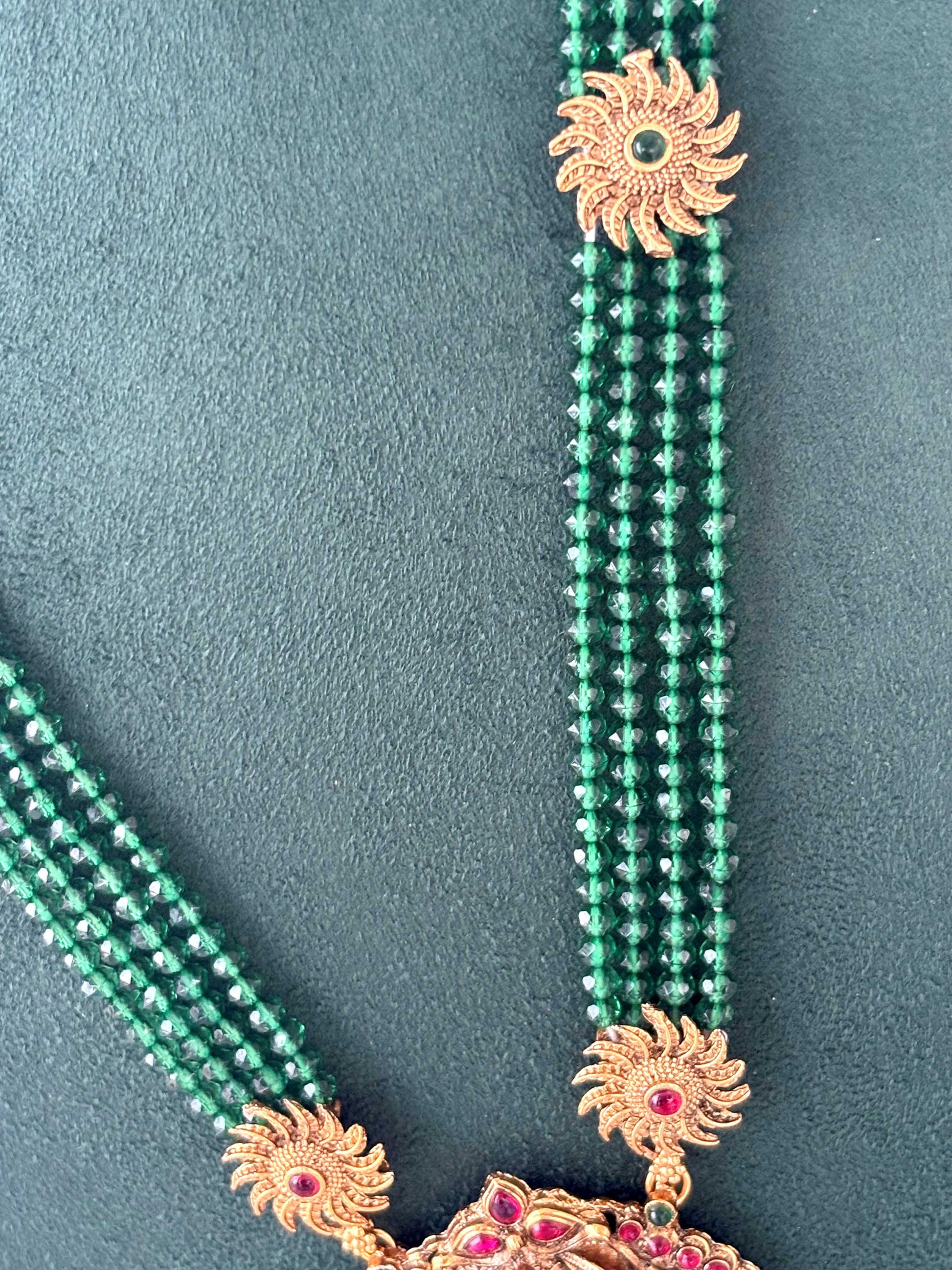 This stunning gold-plated temple necklace combines deep green bead strands with an intricately detailed deity pendant for a timeless ethnic look. Sold with matching jhumkas. Length 22 inches plus adjustable chord.
