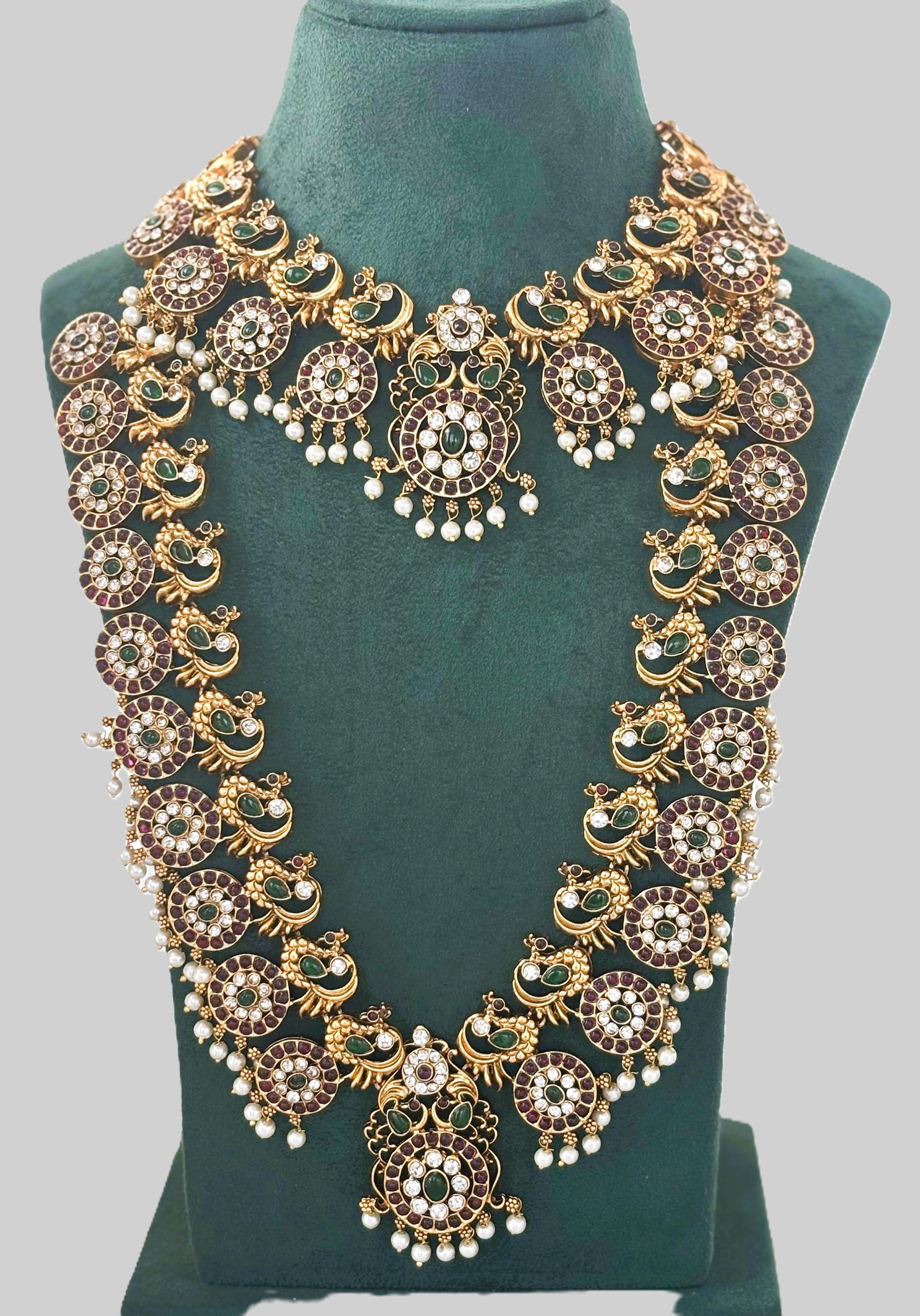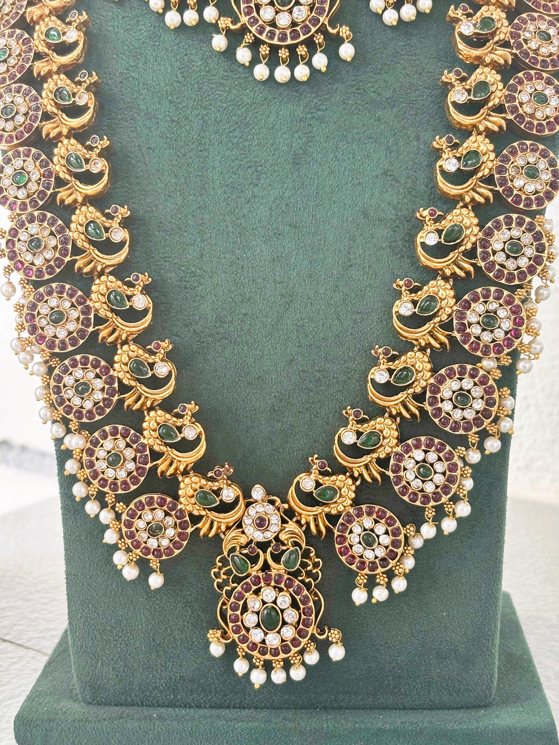 Elevate your bridal elegance with this exquisite antique gold-finished Temple jewelry set. Featuring intricate peacock motifs, vibrant kemp stones, and delicate pearl droplets, this set includes a regal choker, a long haram necklace, and matching earrings for a timeless wedding look. Long haram approximately 18 inches in length with adjustable chord.