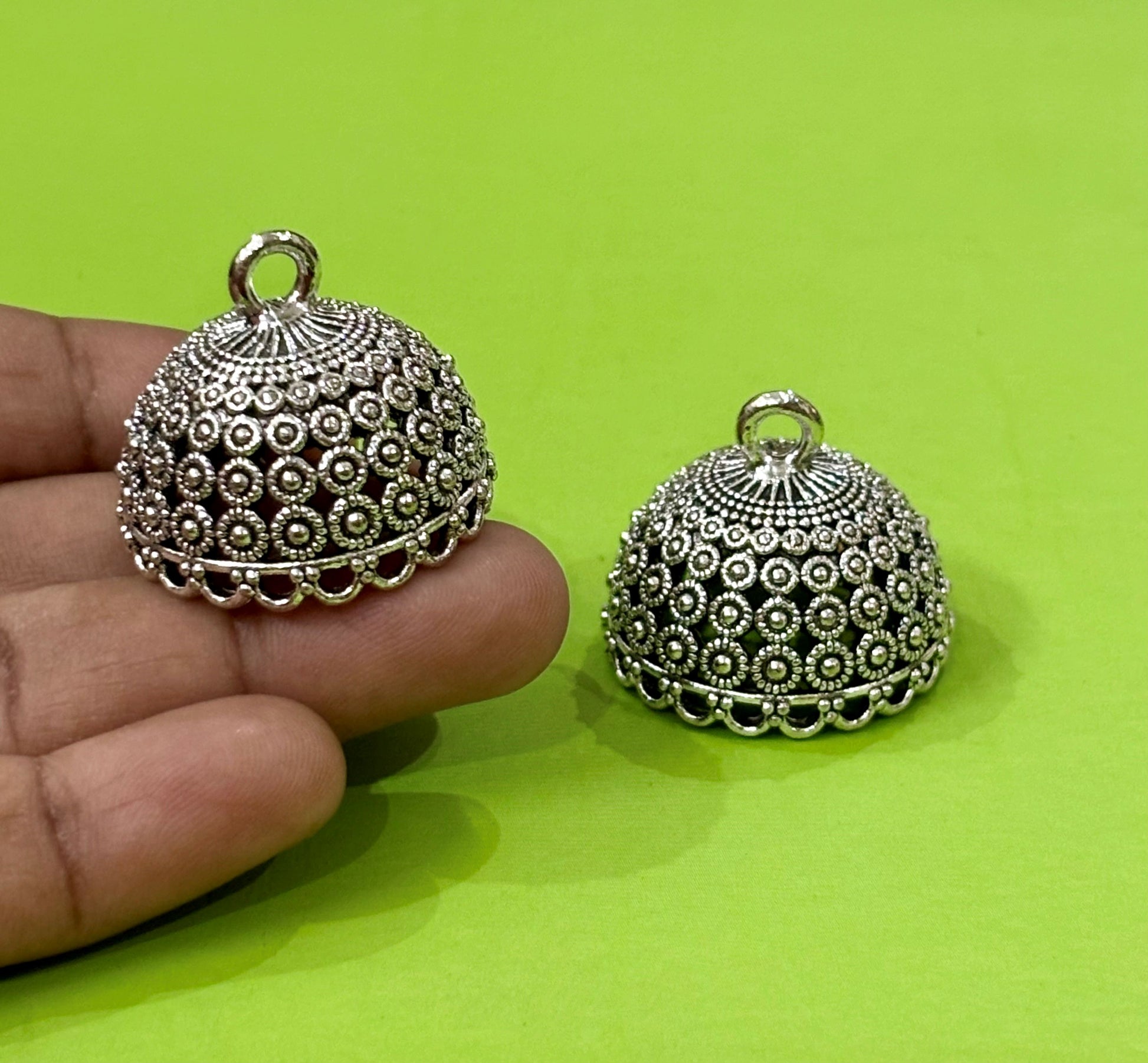 Explore intricately crafted antique silver dome-shaped jhumka base featuring a traditional floral pattern. Perfect for ethnic and festive looks. These traditional Indian earring components are perfect for jewelry making. Pack of two pieces.