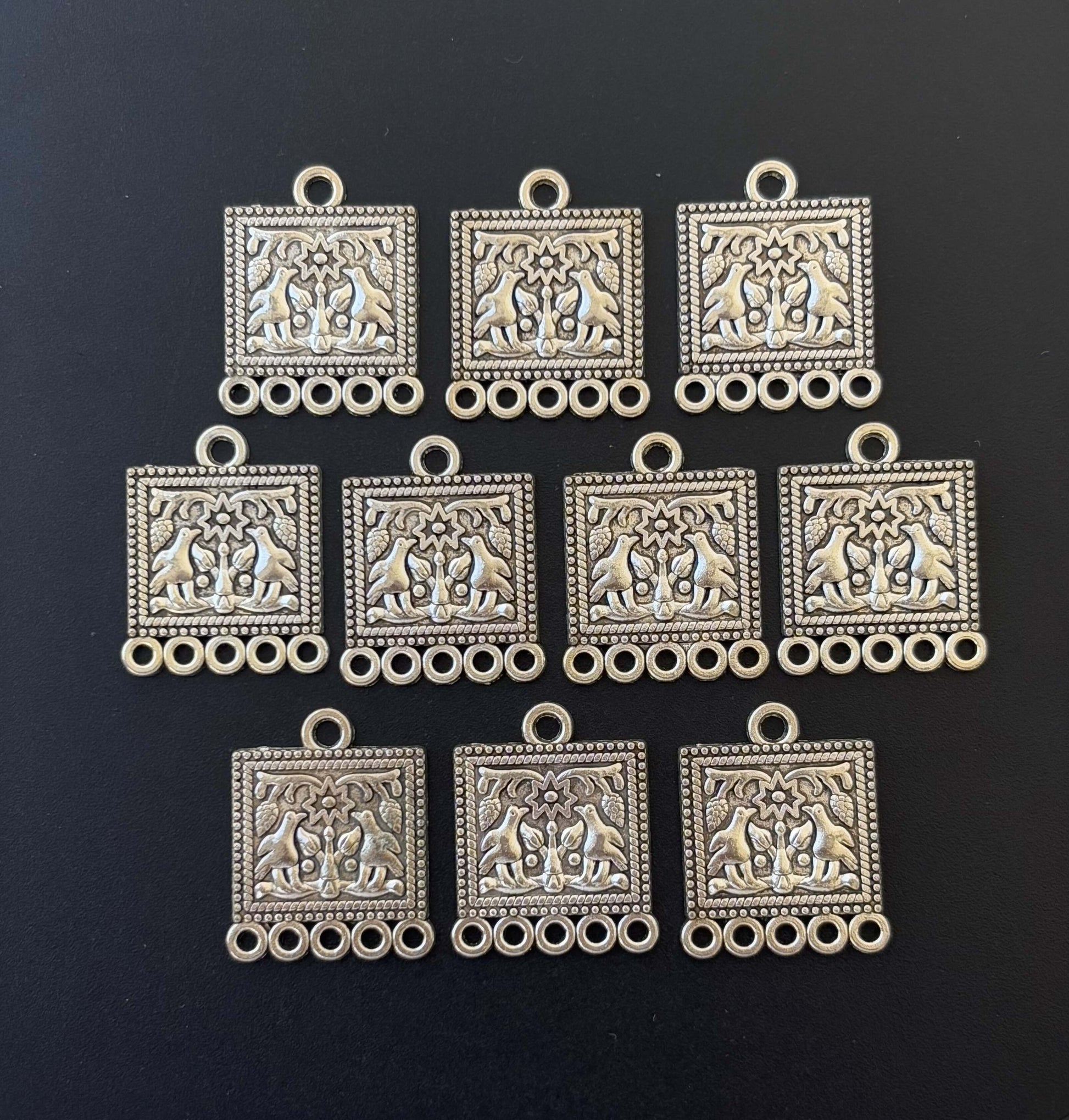 Elevate your designs with these antique silver square connectors, featuring an intricate traditional motif and five bottom loops. Perfect for creating multi-strand ethnic necklaces, bracelets, or unique cultural-inspired DIY jewelry. Pack of 10 pieces.
