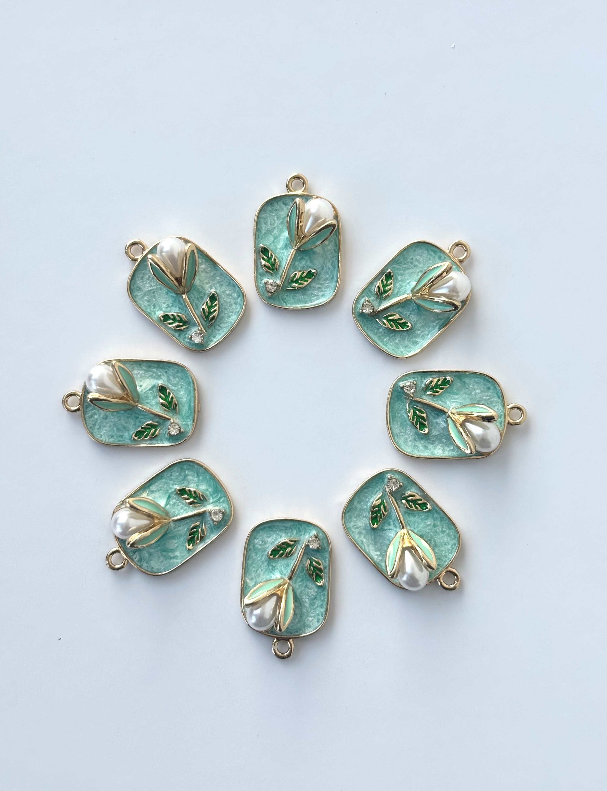 Rectangular aqua enamel charms featuring a gold tulip bud with a pearl center, green leaves, and crystal accents. Pack of single charm.