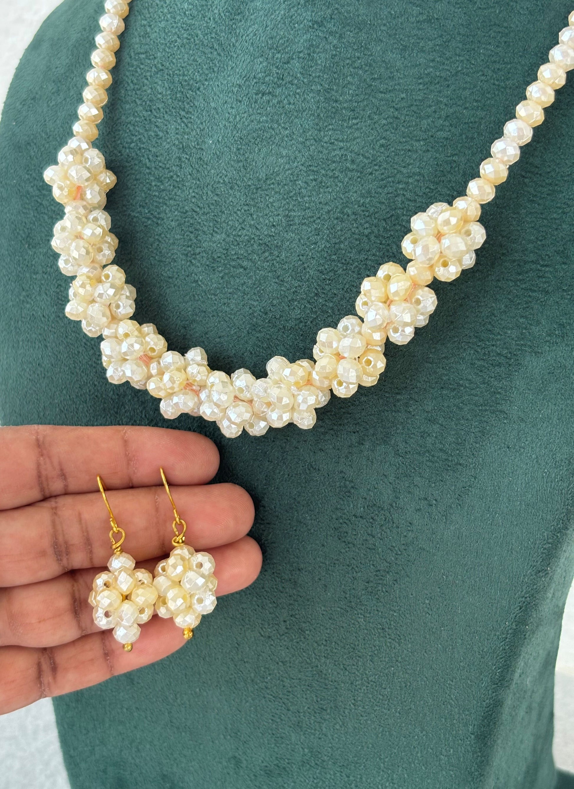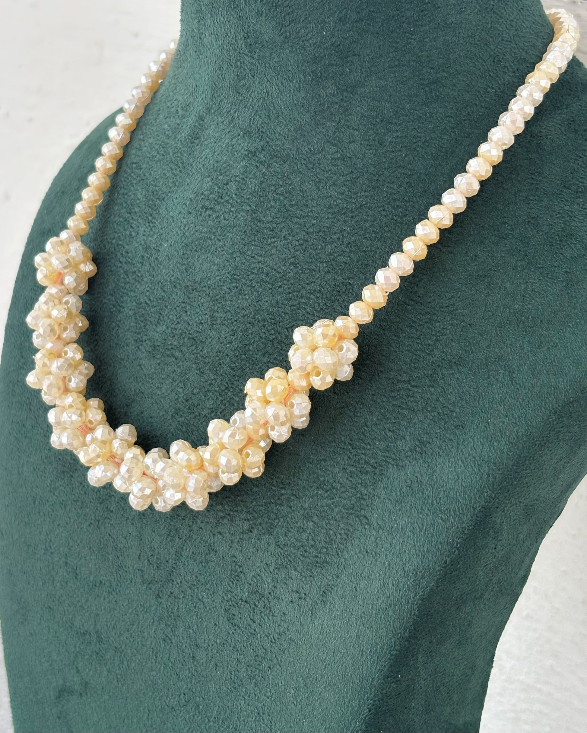 Add a touch of dazzling elegance to your ensemble with this beautiful champagne crystal necklace set, featuring an intricately woven cluster of sparkling faceted beads and matching earrings, perfect for any party or festive occasion.