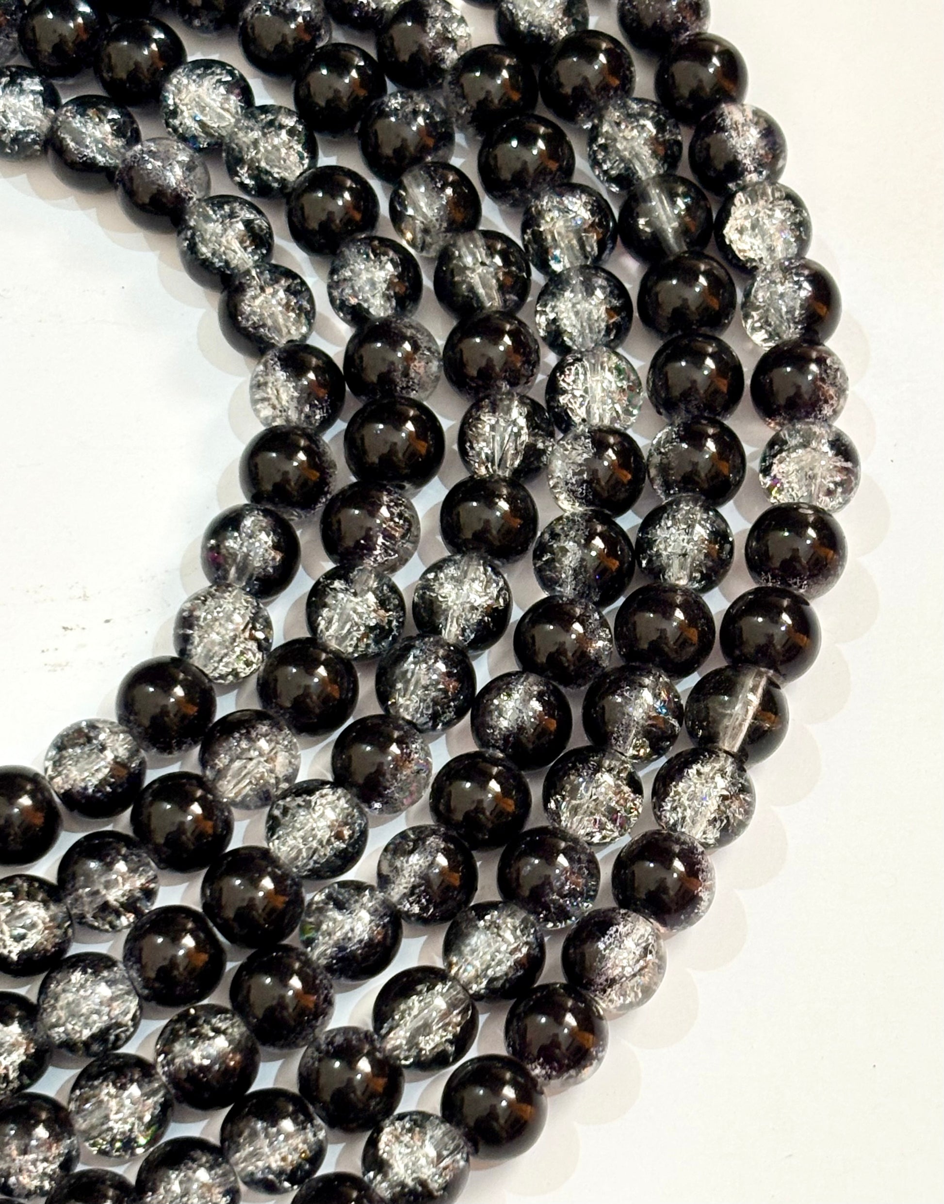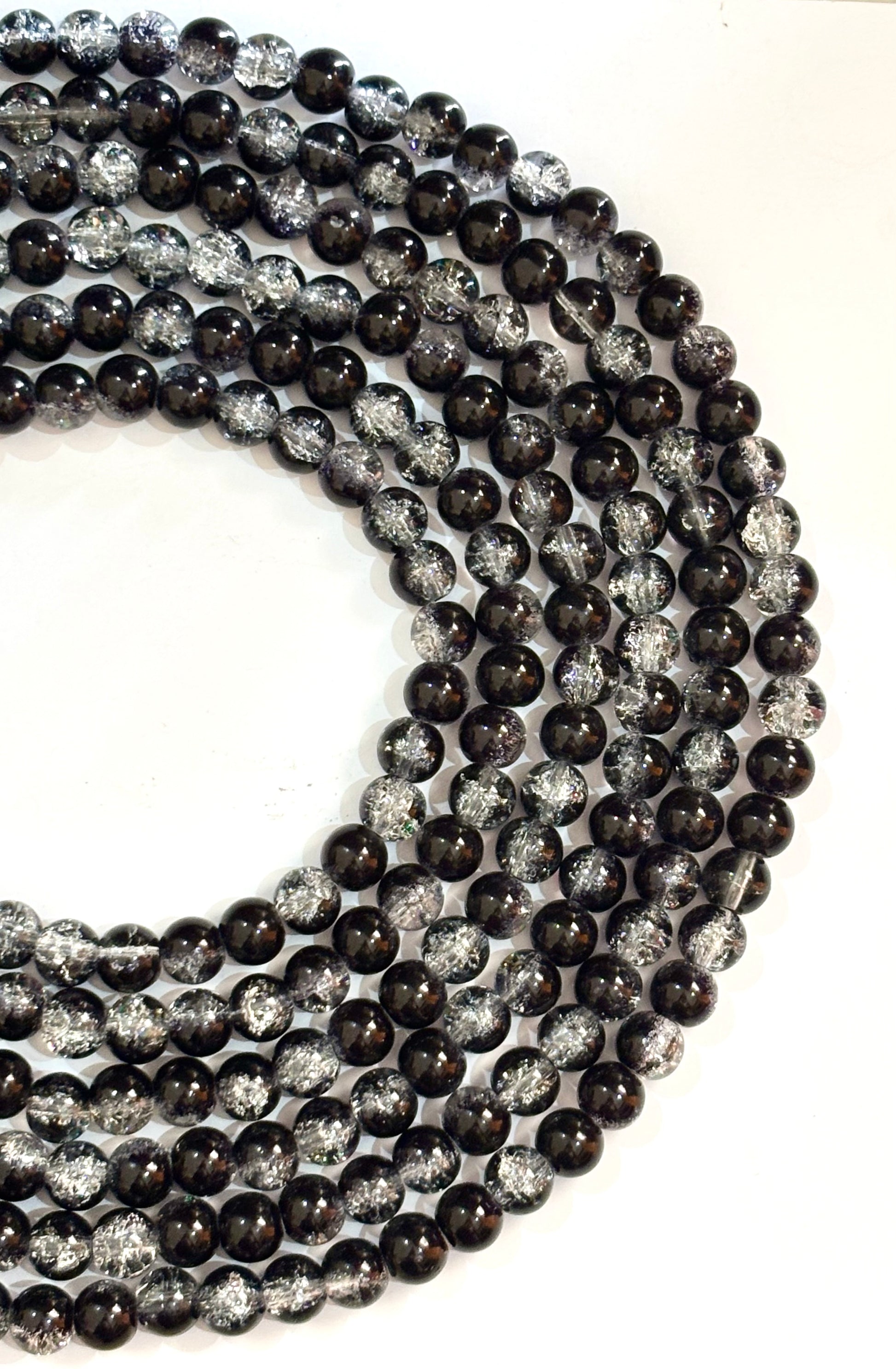 Discover unique 8mm black and clear crackle glass beads, perfect for adding intriguing texture and contrast to your jewelry designs, crafting, and DIY projects. Sold by single strand measuring 15 inches with approximately 54 beads. Size 8MM.