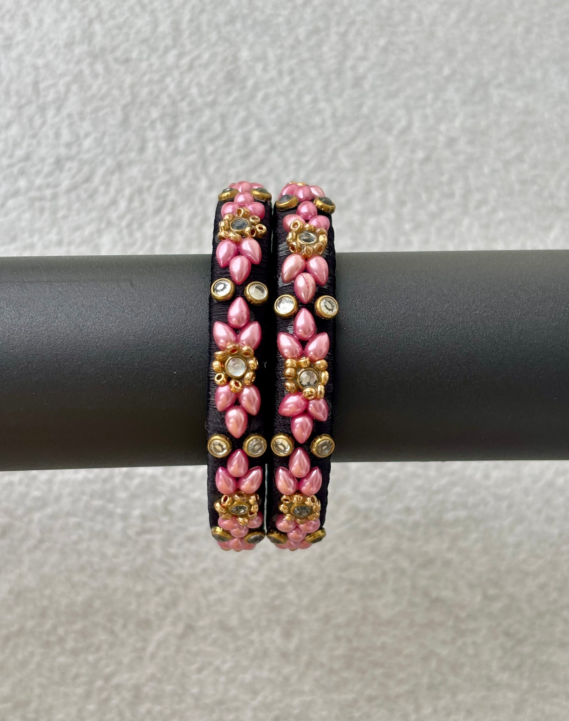 A striking, skin-friendly pair of handmade black silk thread bangles featuring an elegant pink floral design with kundan and pearl work. Set of two bangles. Size 2.6.