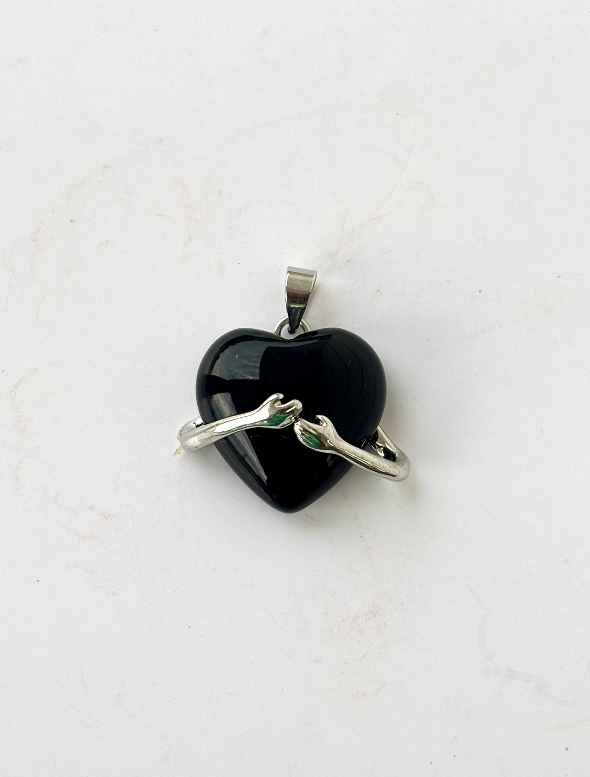 This charming black semi-precious stone heart pendant, embraced by silver-toned hugging hands, makes a unique and heartfelt statement for necklaces or thoughtful gifts. Sold as a single piece.