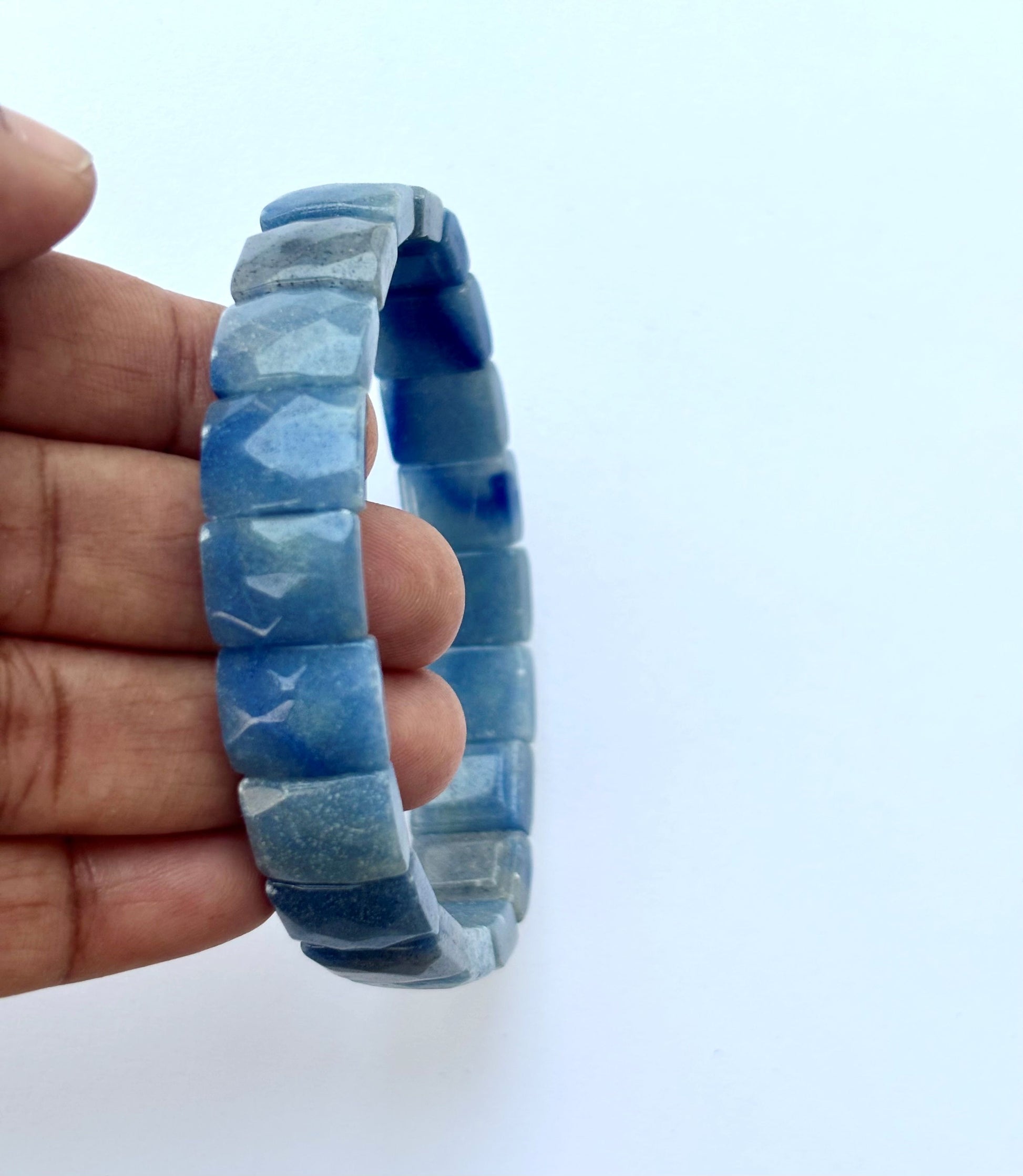 Find your calm with this soothing bracelet featuring faceted rectangular beads of denim-blue Natural Blue Aventurine. Sold as a single piece. Free Size. Bracelet made with strong elastic.
