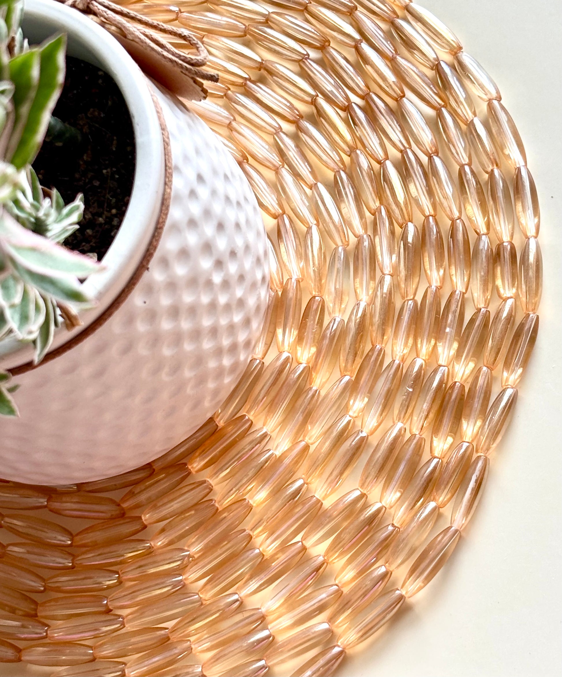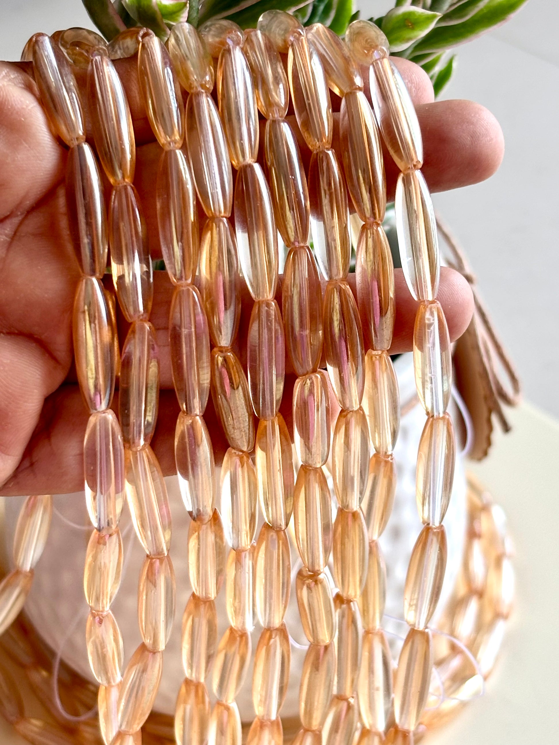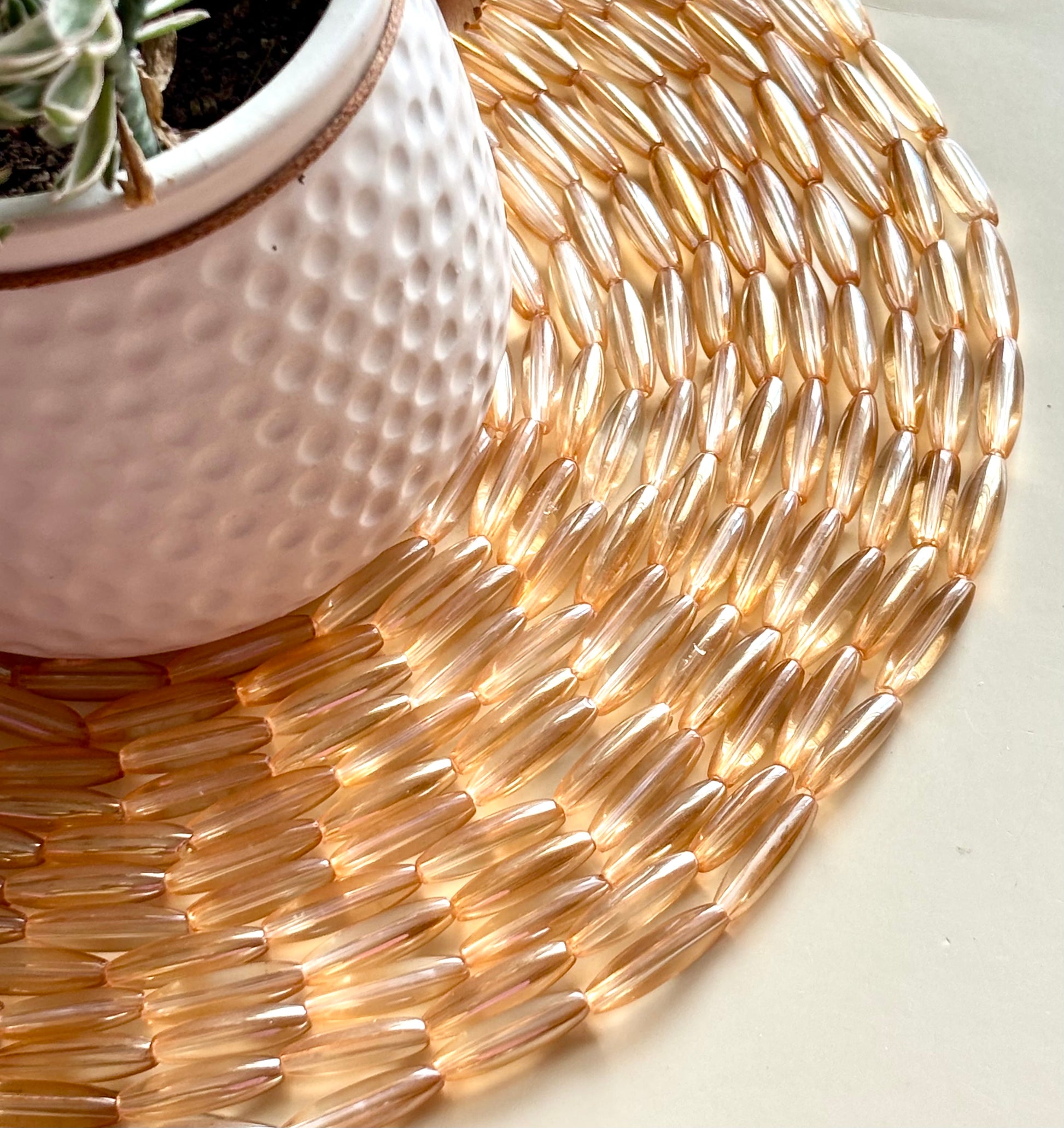Discover elegant champagne-colored 6x21mm smooth barrel, oval or rice shaped glass beads, perfect for unique jewelry designs, crafting, and DIY projects. Sold by single strand. Approximately 20 beads per line measuring 15 inches.