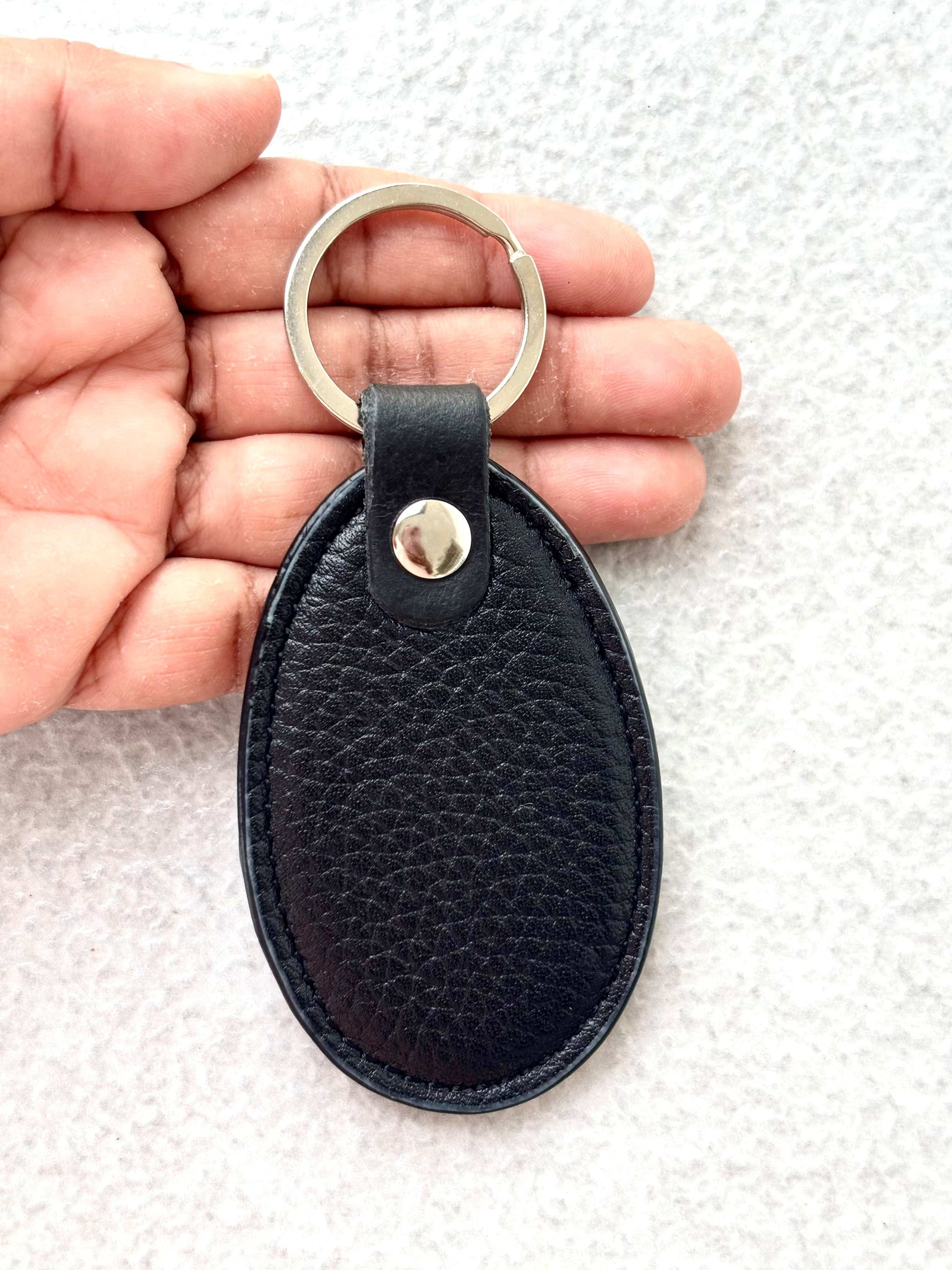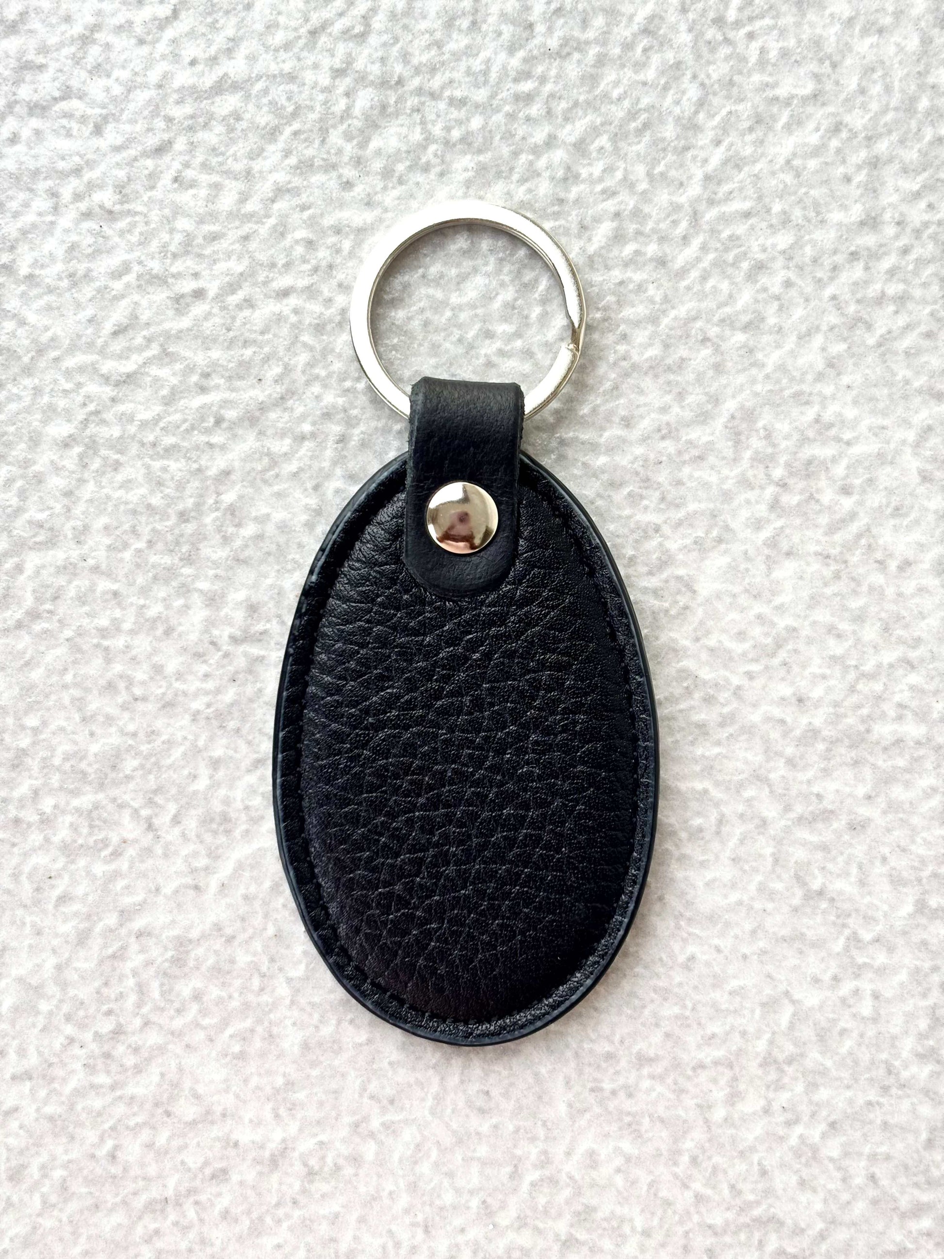 A timeless oval keychain crafted from durable pebbled black leather with a sturdy metal ring. Sold as a single piece.