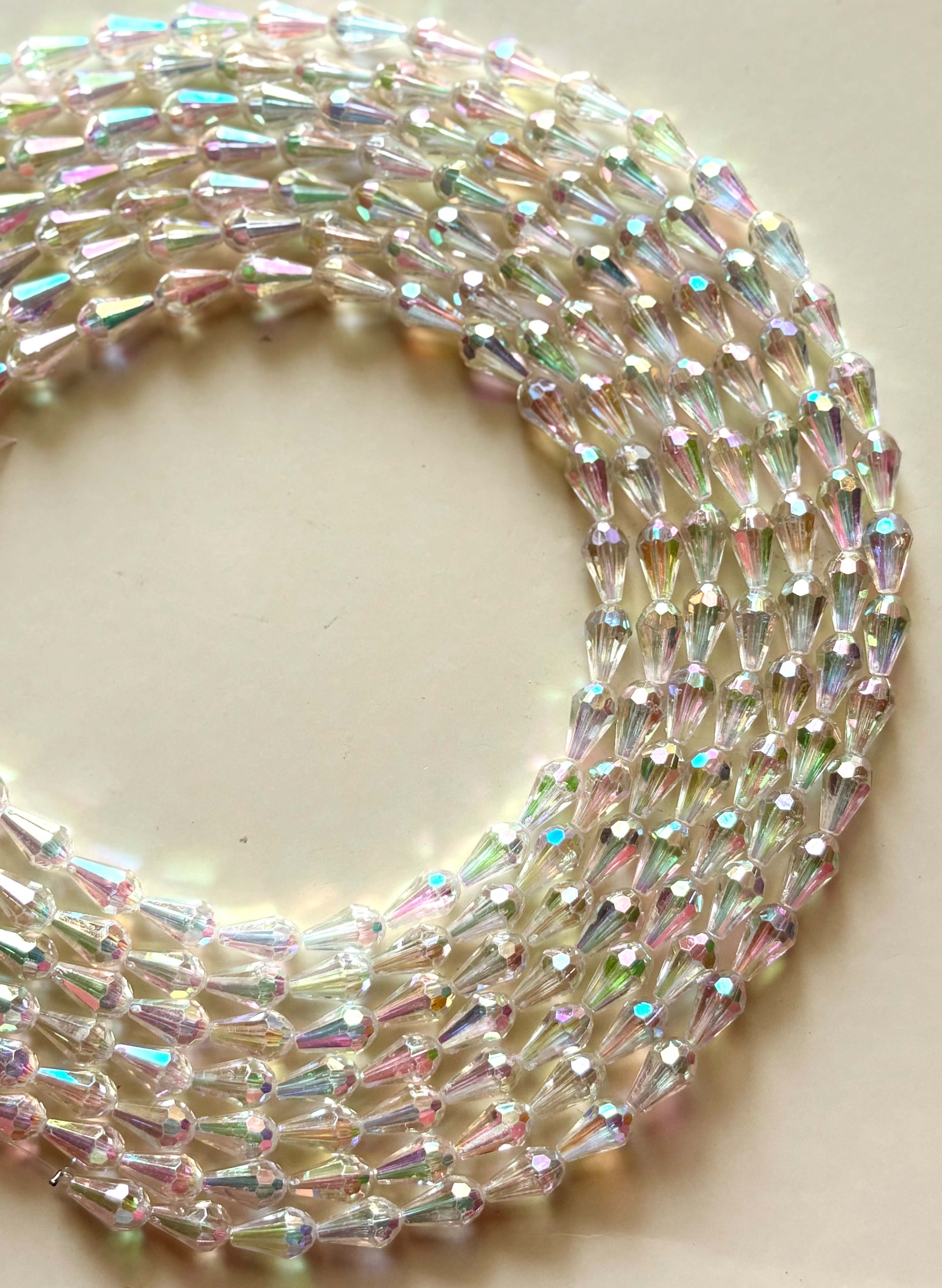 Discover clear faceted drop beads with an iridescent AB (Aurora Borealis) finish, perfect for adding dazzling rainbow sparkle to your jewelry and craft projects. Size 12x8MM. Sold by single strand measuring 15 inches with 30 beads approximately.