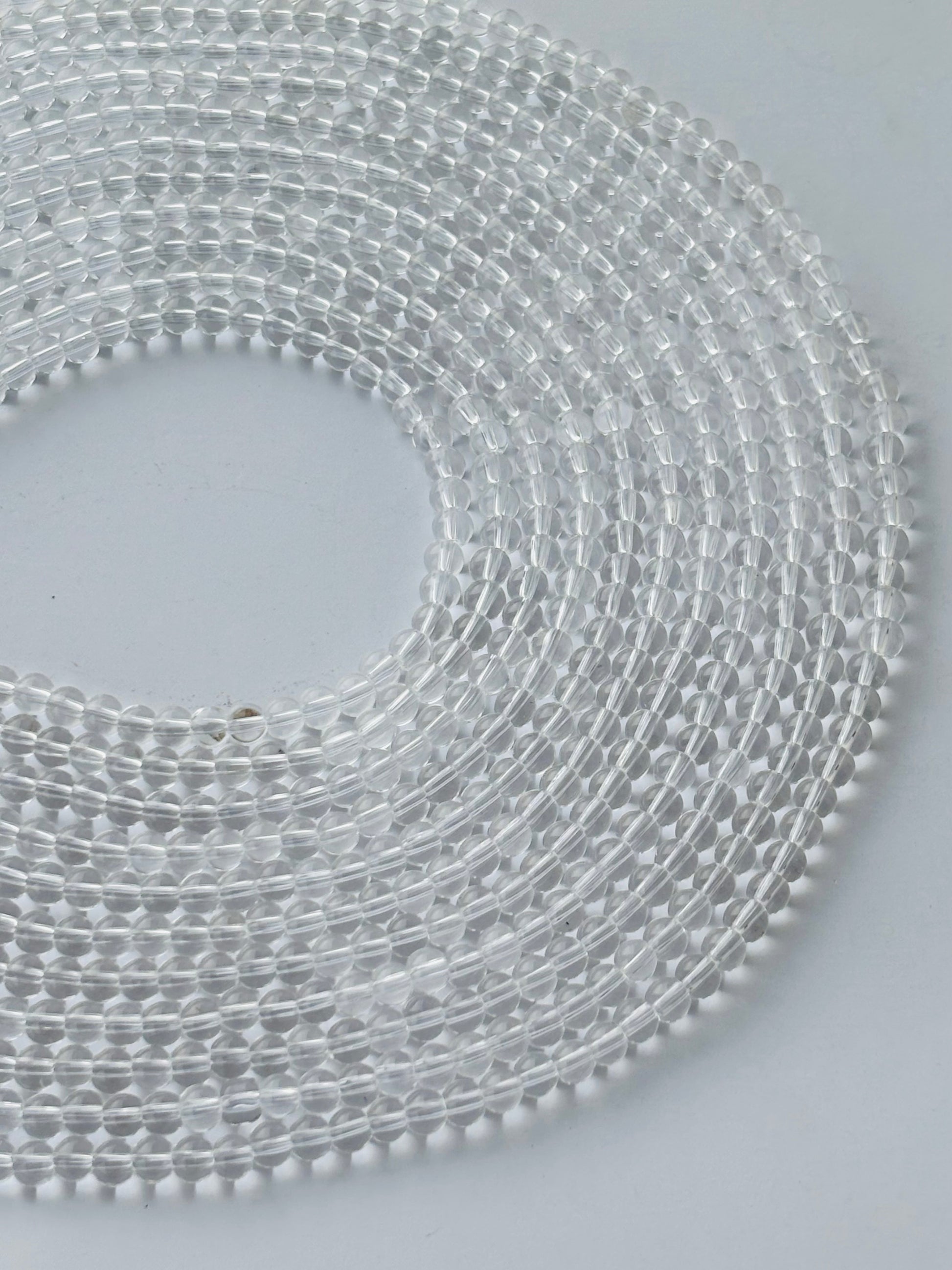 Discover sparkling clear transparent 4mm smooth round glass beads, perfect for elegant jewelry making, crafting, and DIY projects. High-quality and versatile for dazzling creations. Sold by single strand. Approximately 106 beads per line measuring 15 inches.
