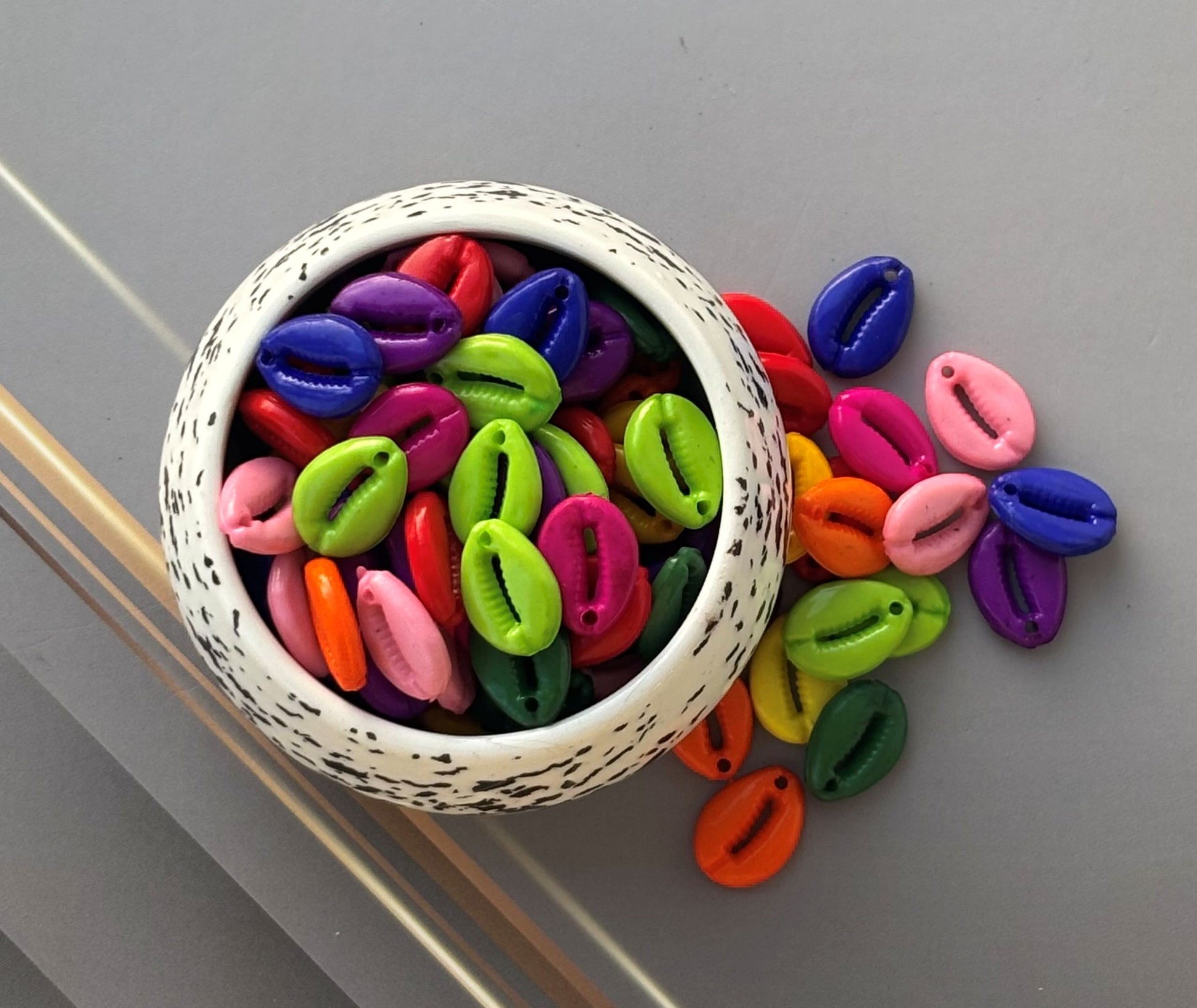 These vibrant multi-colored cowrie shell shaped beads are perfect for adding a bohemian, beachy, or playful touch to your jewelry designs, hair accessories, and craft projects. Pack of 25 beads approximately. Size 15MM.