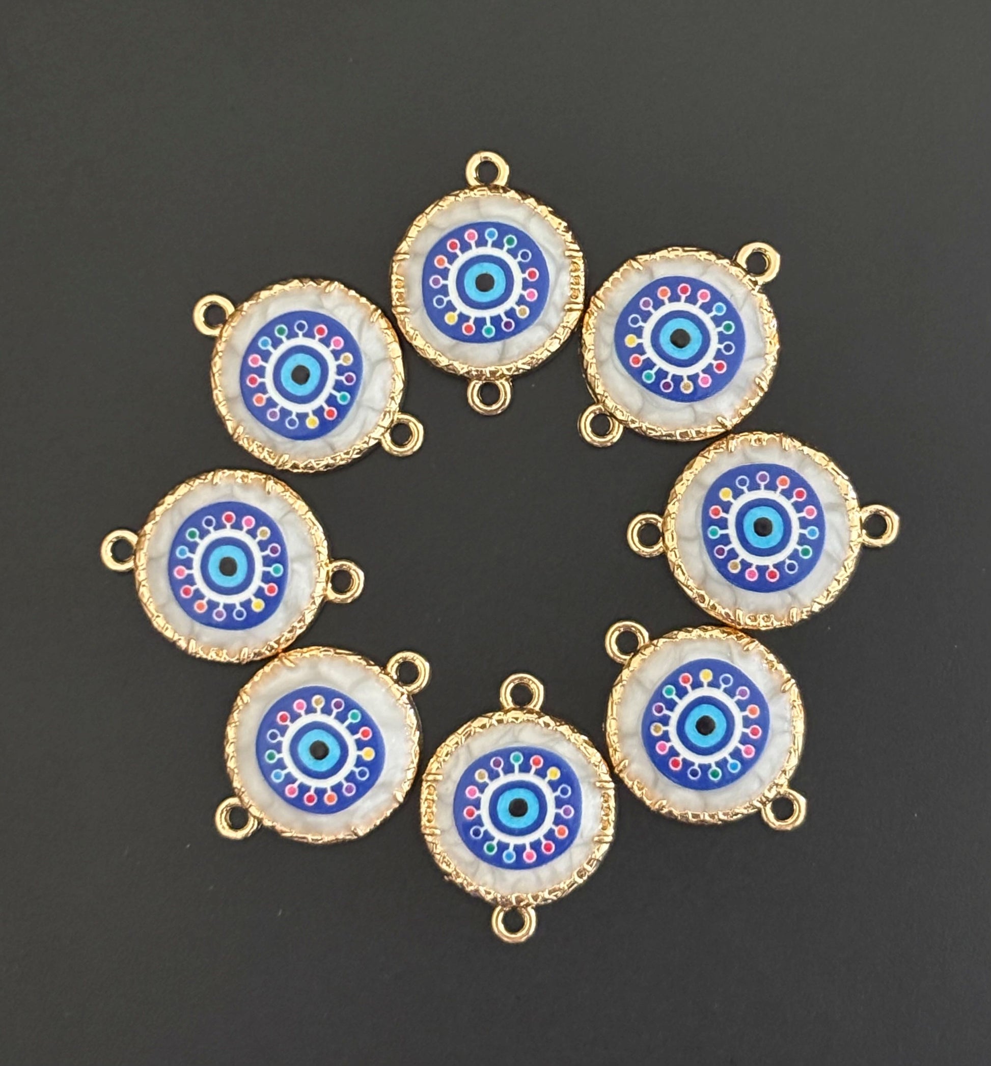 These vibrant gold-plated round resin charms feature an intricate blue evil eye design with colorful accents, perfect for creating protective jewelry and distinctive accessories. Sold as a single piece. Size 23x18 MM.
