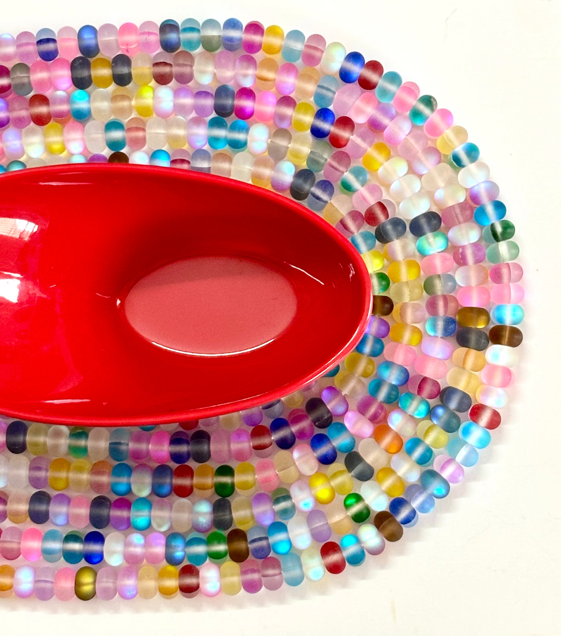 Explore vibrant multi-color frosted aura quartz beads, perfect for unique jewelry making. These beautiful mermaid glass beads offer an iridescent shimmer, ideal for necklaces, bracelets, and earrings. Pack contains one strand of 15 inches with 73 beads approximately. Size 4x7MM.