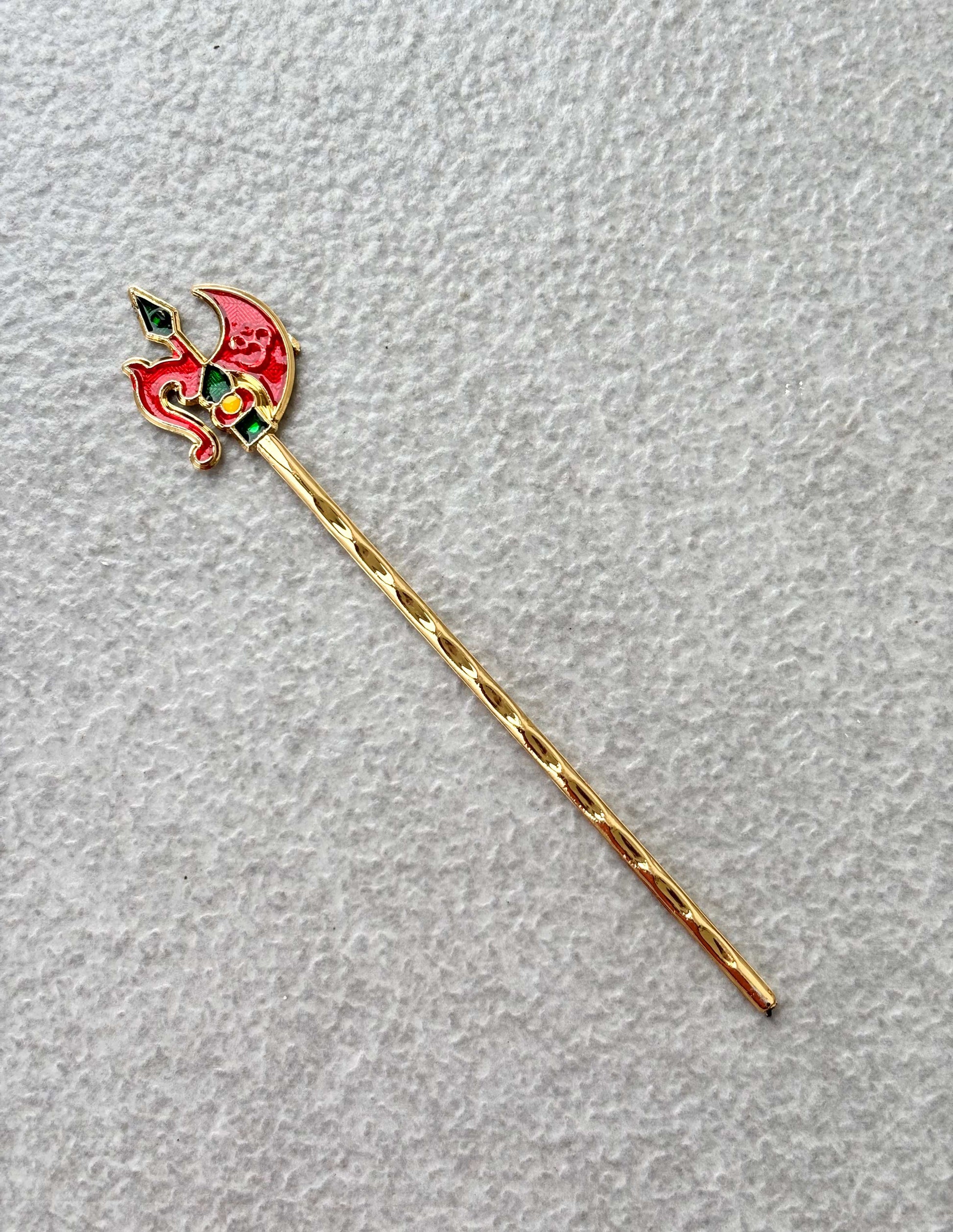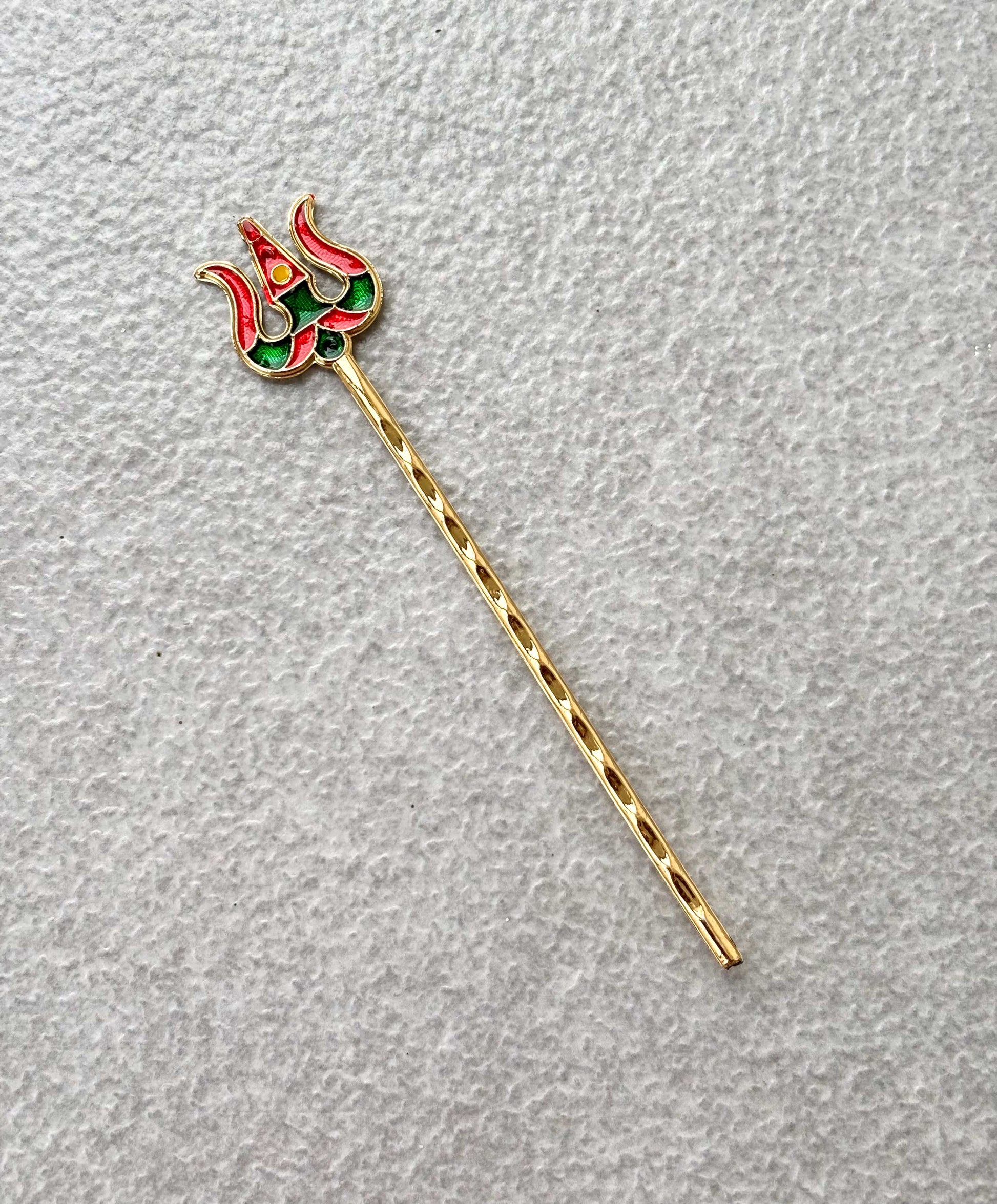 Lightweight gold-finished acrylic trishul with red and green enamel-style detailing, ideal for deity shringar (idols) and religious crafts. Set of two items.