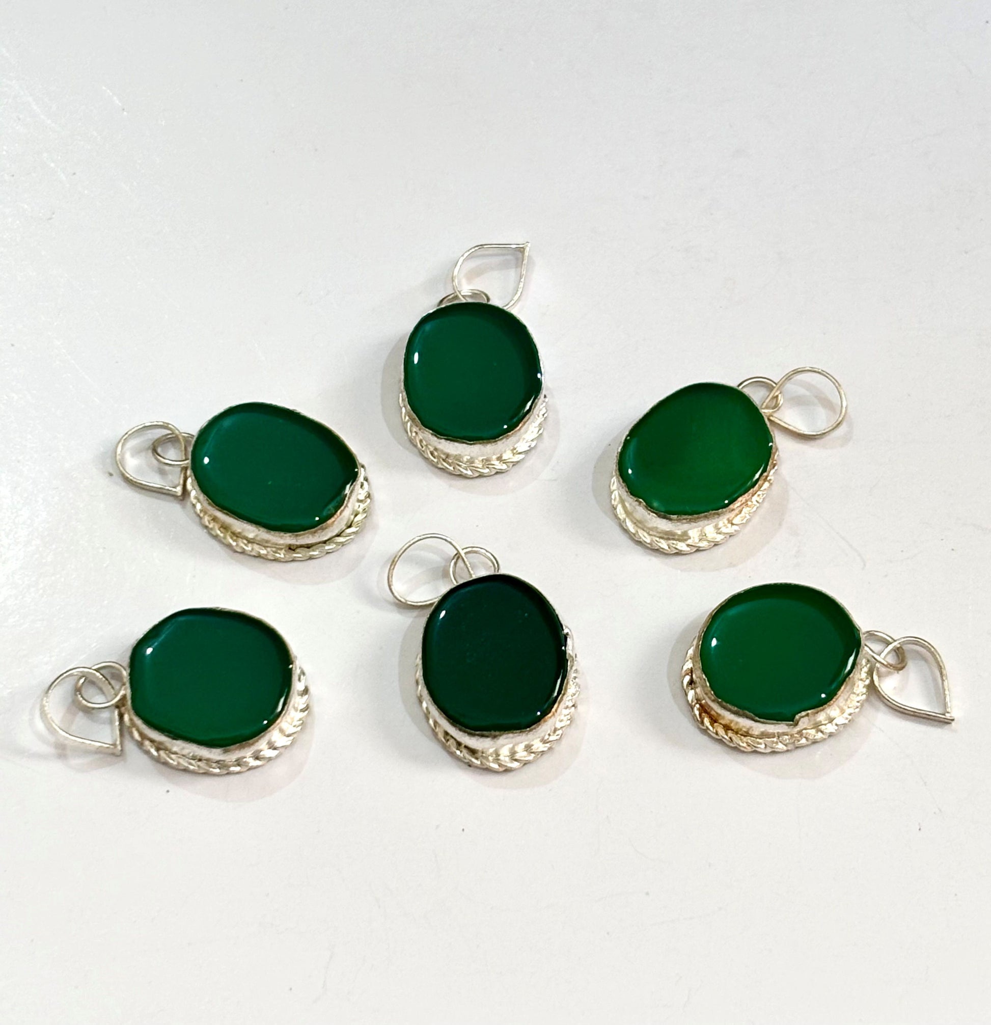 Discover these vibrant pendants featuring smooth, deep green stones, beautifully set in a twisted rope silver-tone bezel. Sold as a single piece.