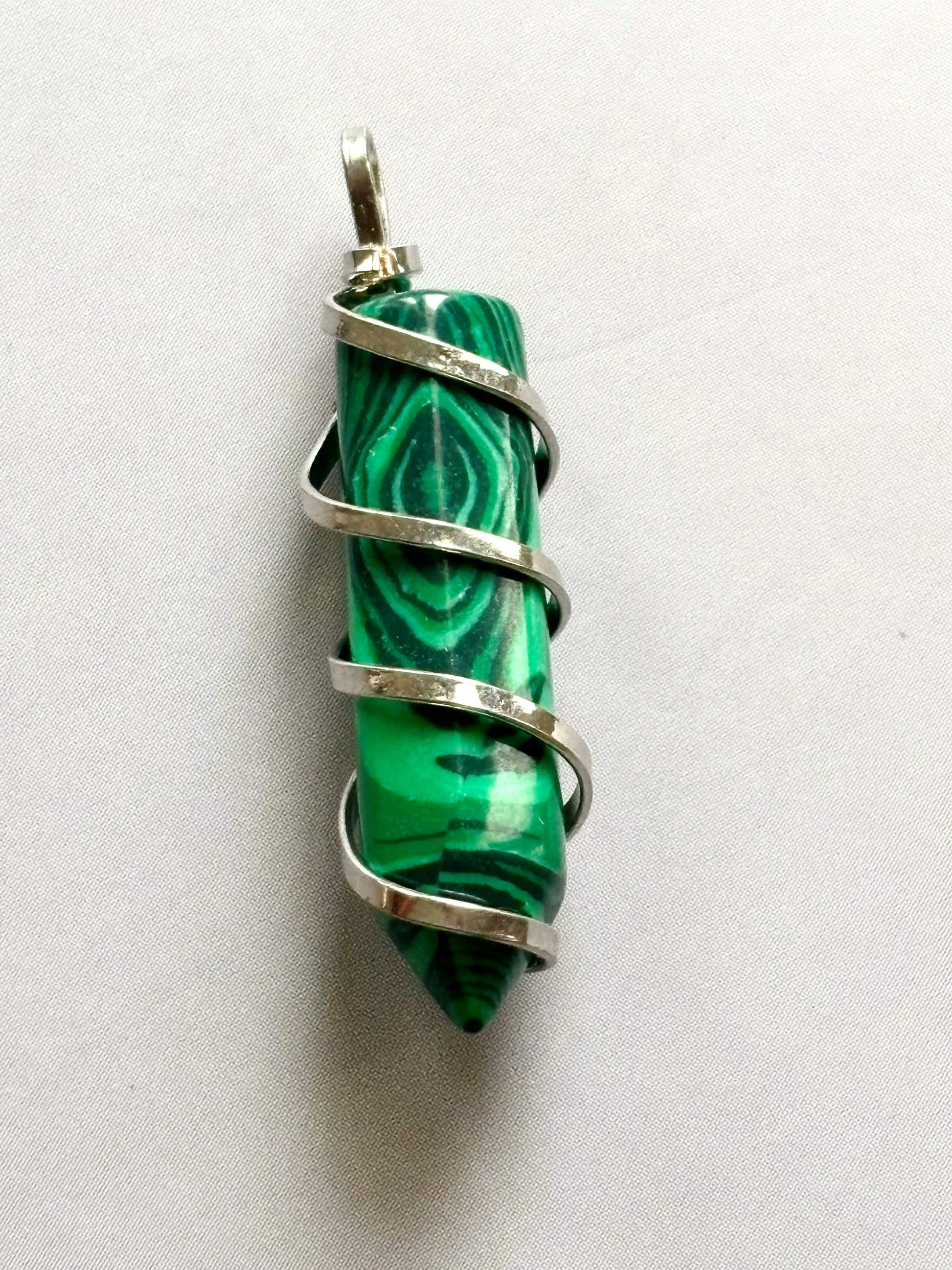 This striking semiprecious stone pendant features a vibrant green malachite-like point, elegantly wrapped in a spiral wire, perfect for unique necklaces and energy healing jewelry. Sold as a single piece.