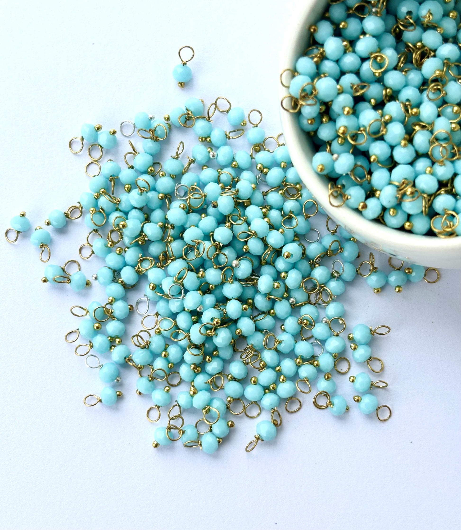 Create elegant handmade jewelry with these sparkling, artic blue faceted bead charms, featuring gold wire wrapping. Pack of 100 pieces.
