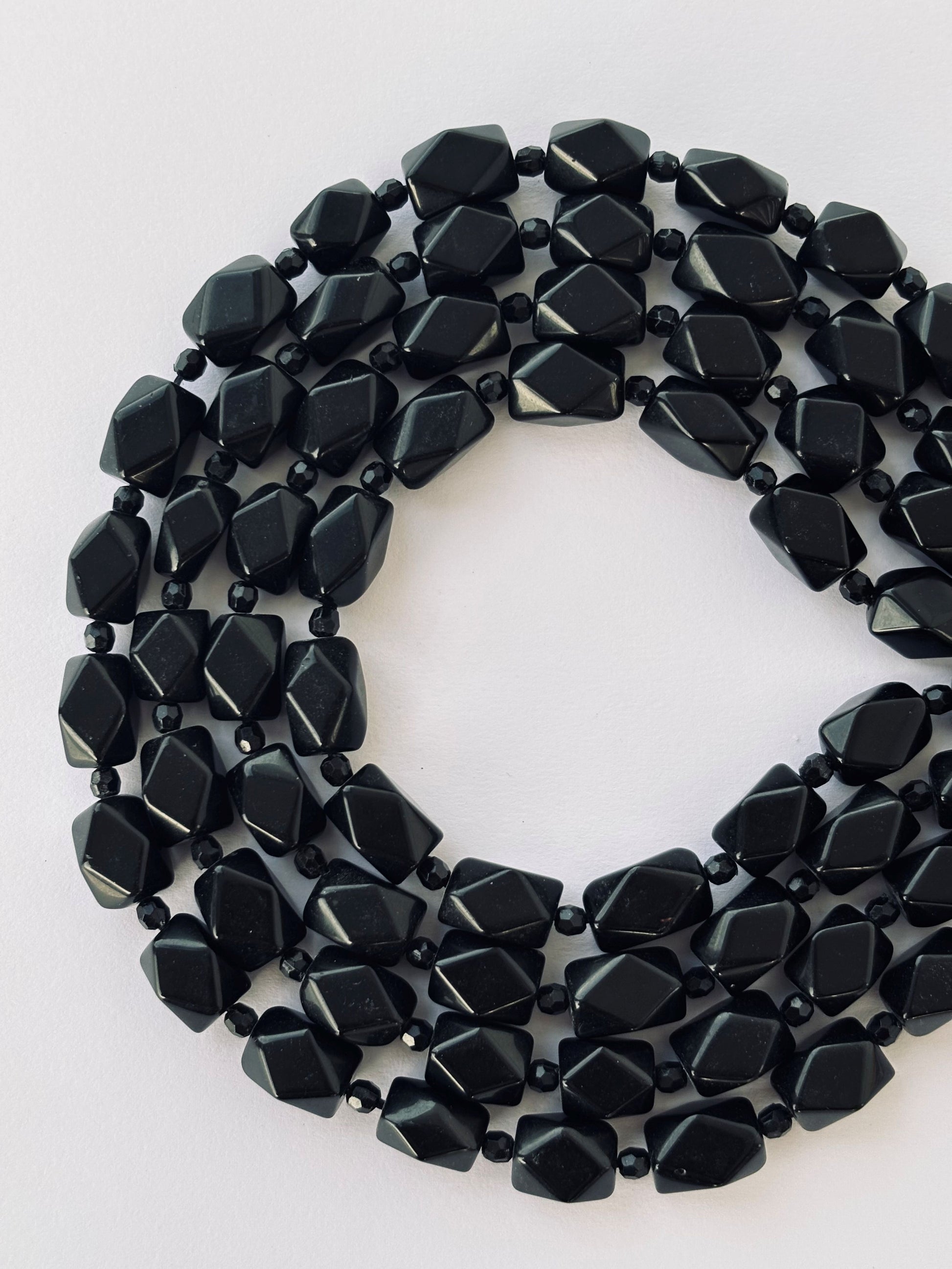 Discover sleek faceted black onyx geometric-shaped beads, perfect for crafting modern, sophisticated necklaces, bracelets, and other distinctive jewelry designs. Sold by a single strand measuring 15 inches with 23 beads approximately. Size: faceted uneven.