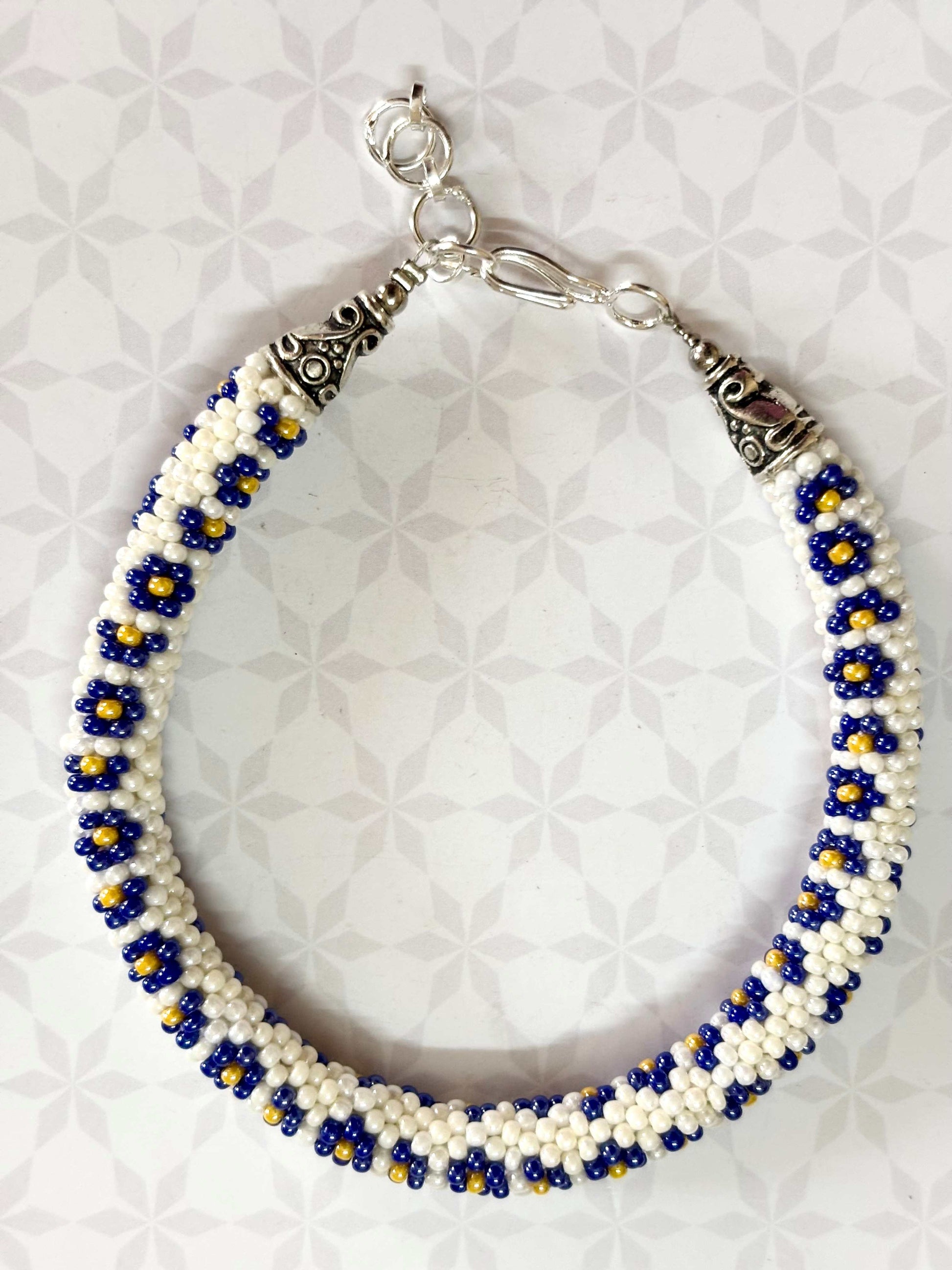 A beautifully handcrafted crochet bracelet featuring a delicate blue and gold floral pattern on white beads, finished with an ornate silver-tone toggle clasp. Sold as a single piece. Total length 8.5 inches plus one inch adjustable rings.