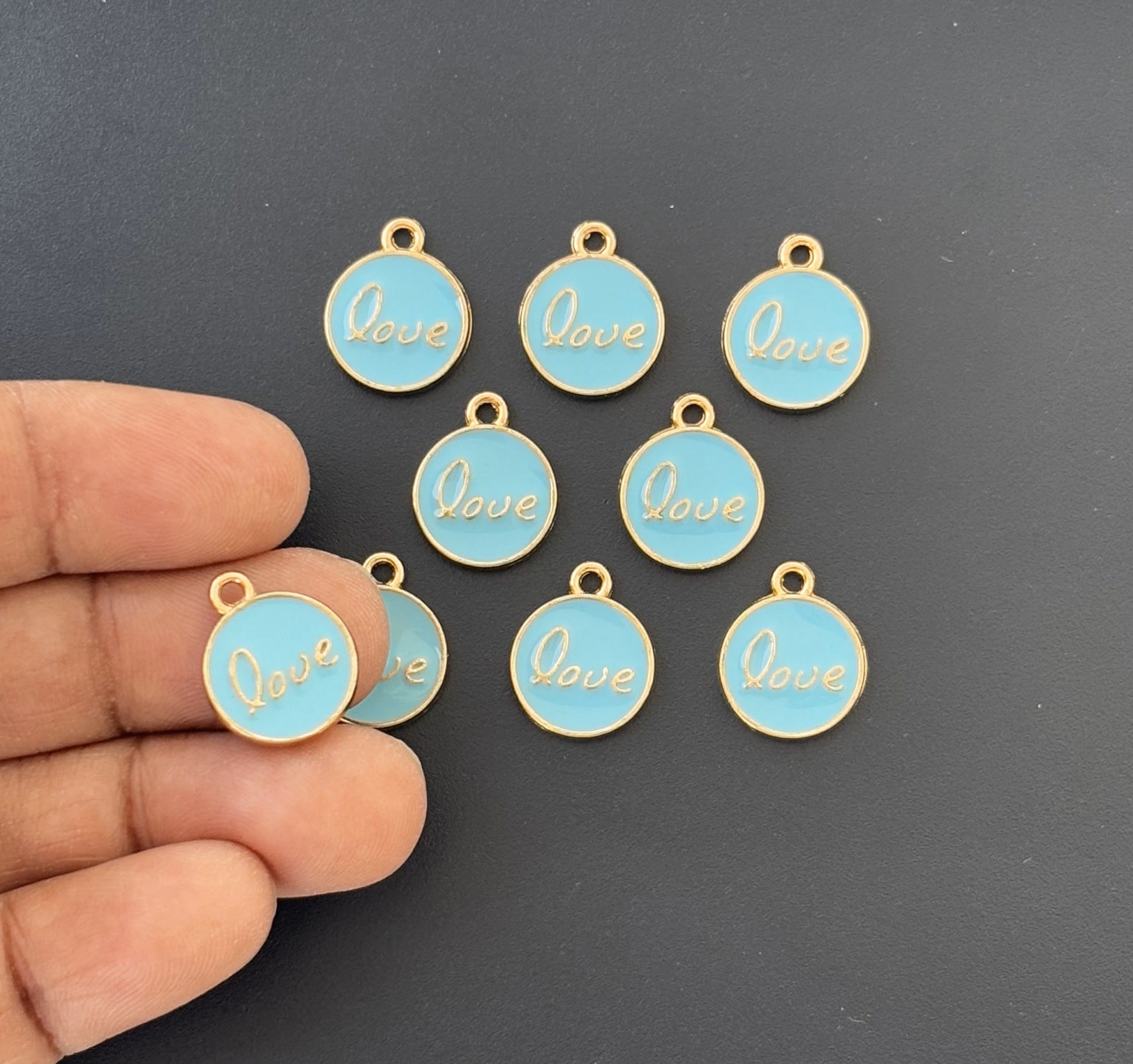 With a blue enamel foundation and gold-tone cursive writing, these circle charms are ideal for giving a romantic flair to bracelets, necklaces, earrings, keychains, and handcrafted gift ideas. Pack of four charms.