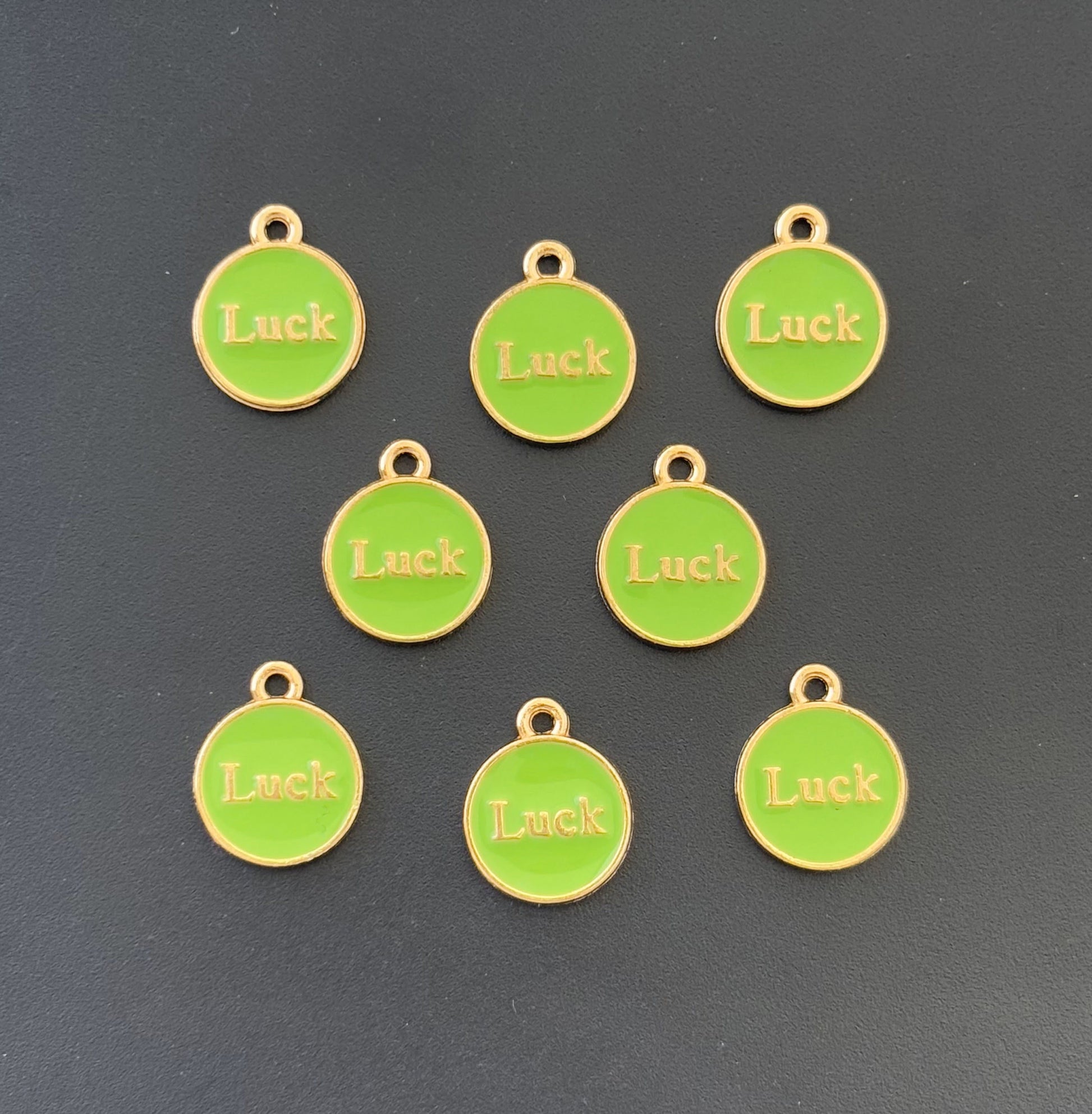 Add a sprinkle of good luck to your handcrafted items with these bright green enamel charms that have the word "Luck" engraved on them. Light, gold-lined, and perfect for infusing your DIY jewelry with positivity. Pack of four charms.