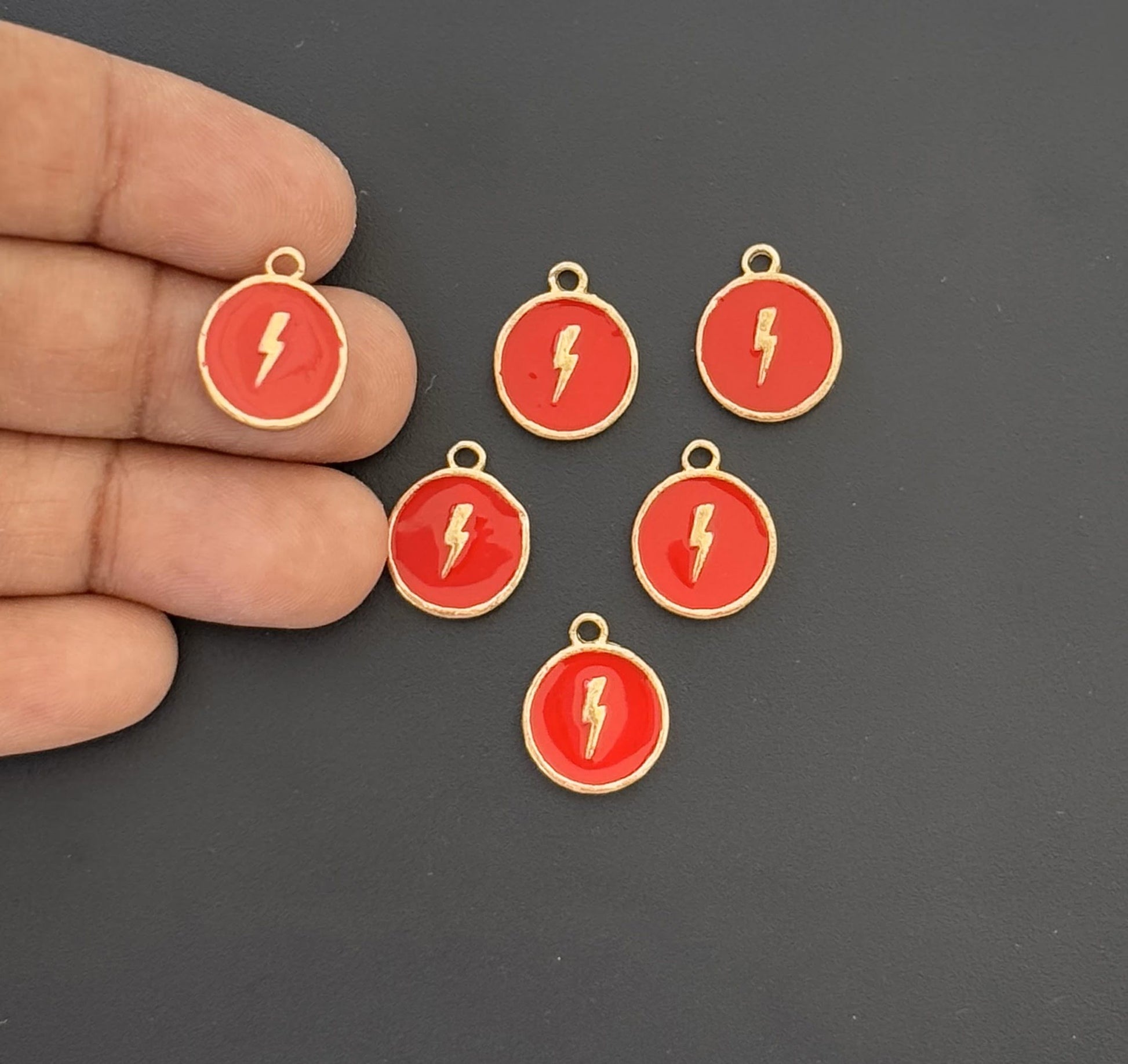 Give your homemade jewelry designs a touch of sparkle with these round red enamel charms in gold lightning bolt design. Pack of four charms.
