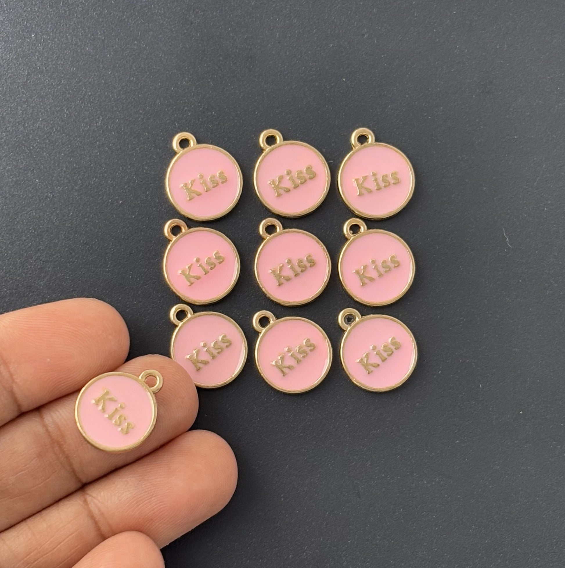 Gild your products with a sweet touch of love using these lovely pink enamel "Kiss" charms. Pack of four charms.