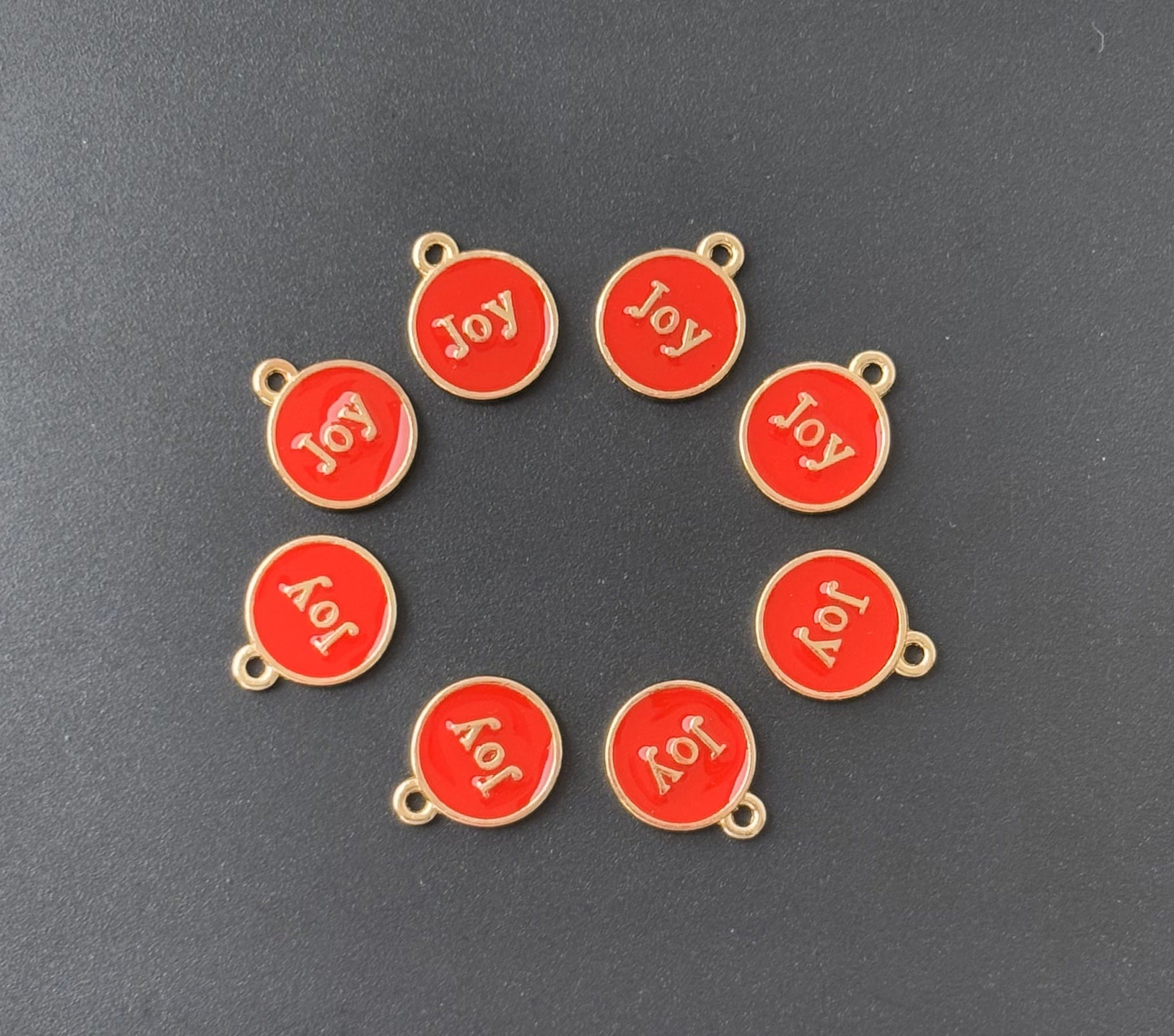 Celebrate happiness and creativity with these vibrant red enamel "Joy" charms. Pack of four charms.