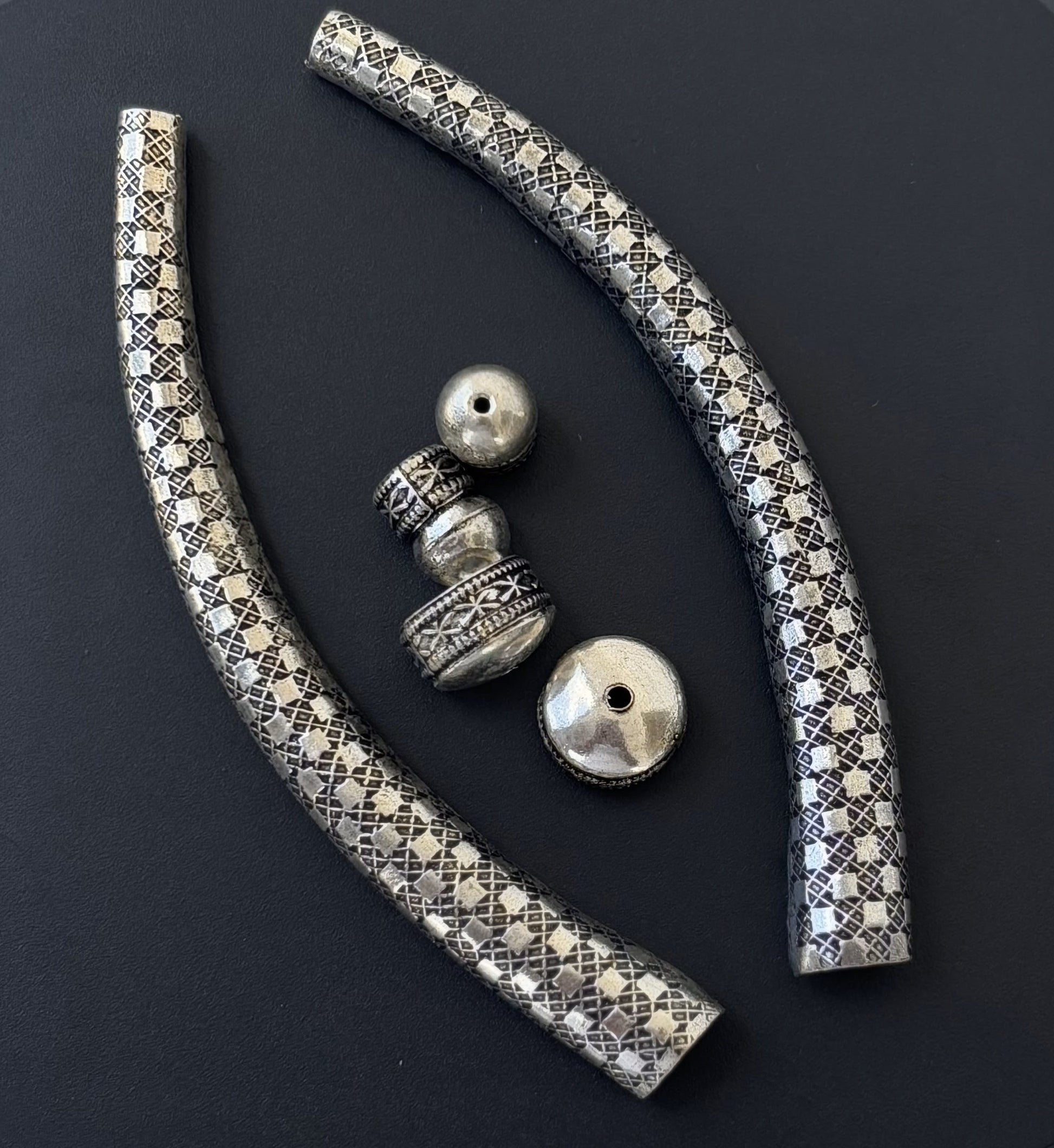 Discover unique German Silver hasuli trunks featuring an intricate geometric or diamond crosshatch design, perfect for crafting distinctive tribal and traditional necklaces. Enhance your jewelry projects with these detailed metal components. Pack contains one set of trunk.