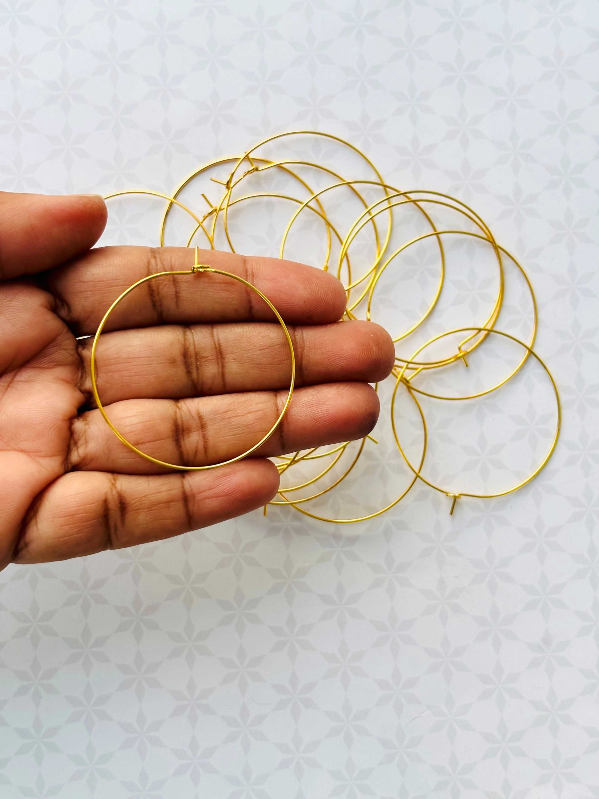 High-quality gold-tone round wire hoops with a secure latch closure, ideal for DIY beading and custom earring designs. Pack of 20 pairs of hoops. Size 40MM.
