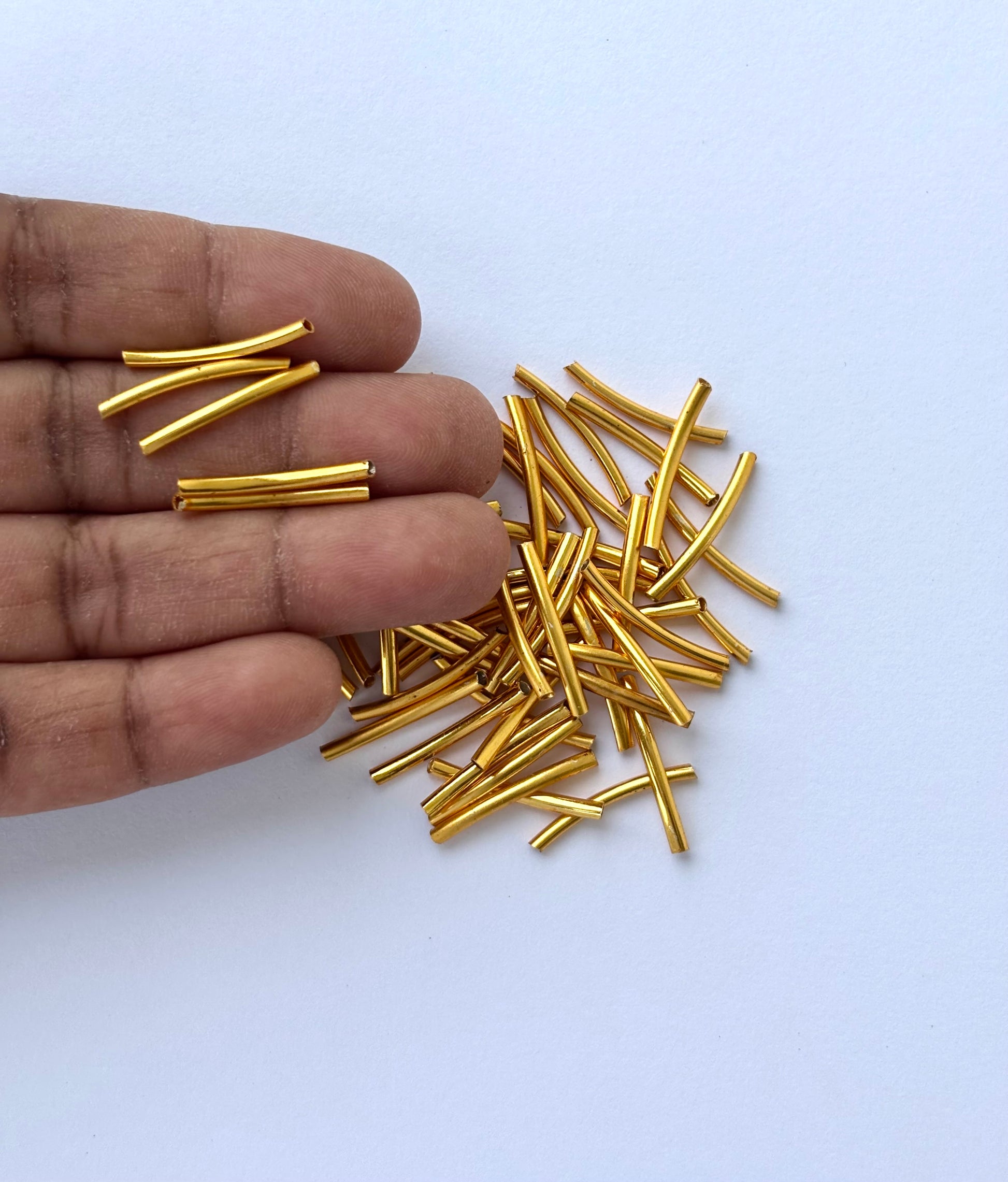 Add a sleek, modern touch to your handmade bracelets and necklaces with these versatile, gold-colored curved metal pipe beads. Pack of 20 pieces. Size 18x2mm.