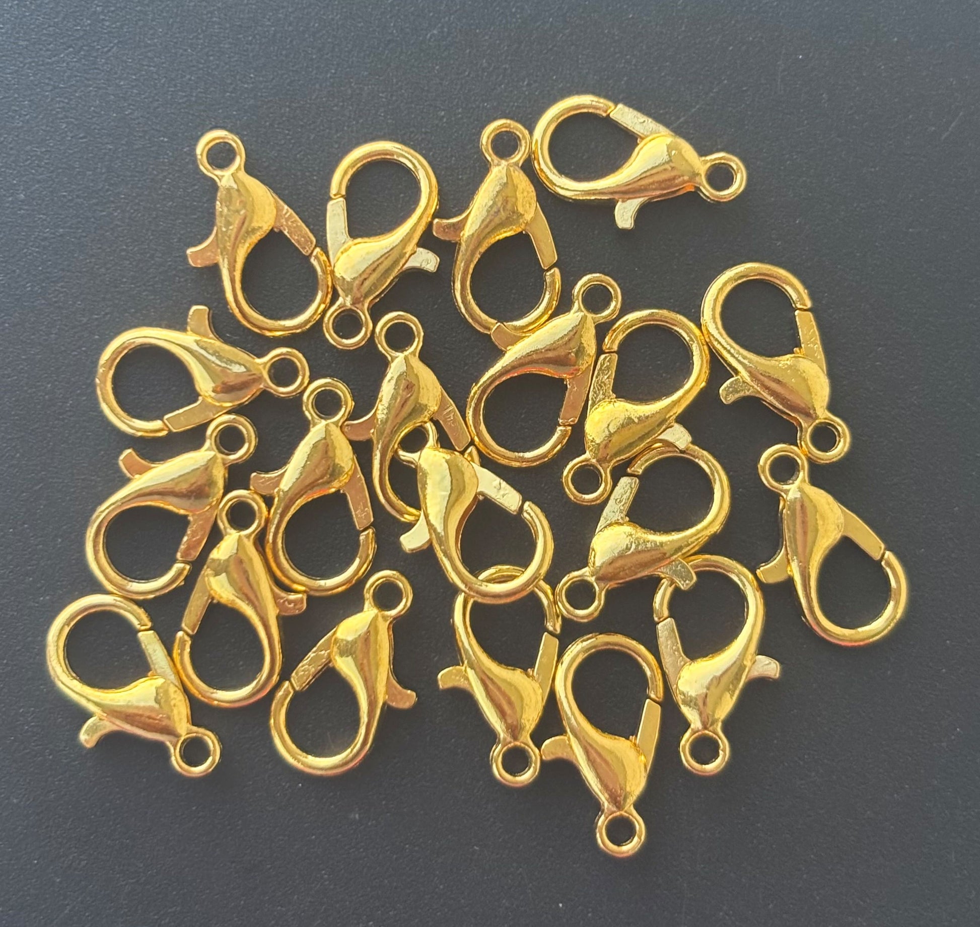 Secure your handmade jewelry with these durable gold-plated lobster clasps, perfect for necklaces, bracelets, and anklets. Size 11MM. Pack of 20 pieces.