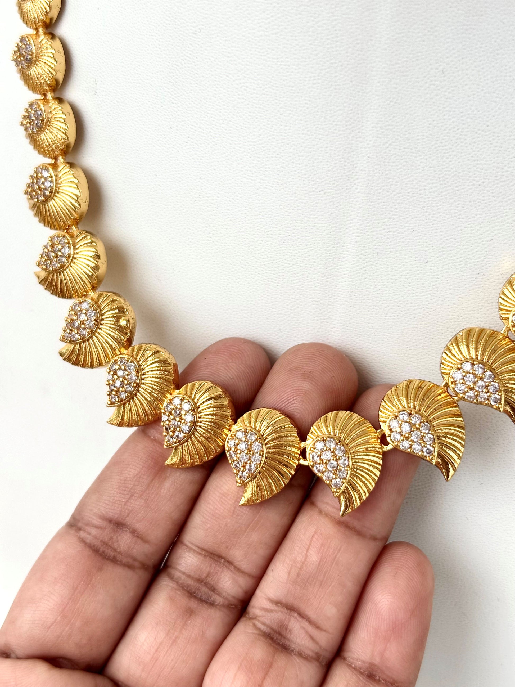 Adorn yourself in timeless tradition with this exquisite gold-plated manga malai necklace, featuring intricate AD-studded mango motifs and a skin-friendly, allergy-free finish.