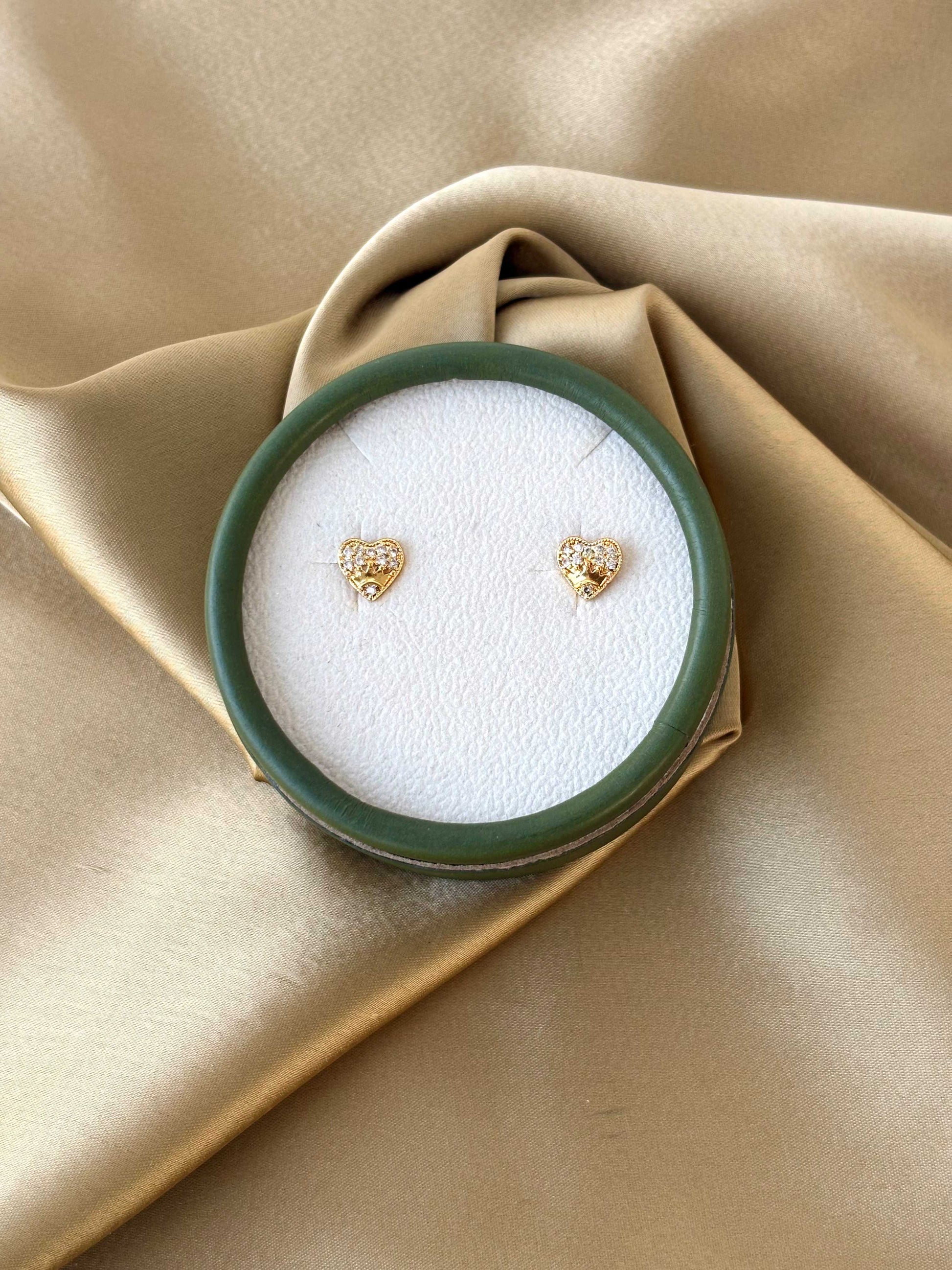Charming gold-plated heart-shaped studs featuring sparkling white crystals and a delicate gold crown accent. Skin friendly for comfortable, everyday wear.