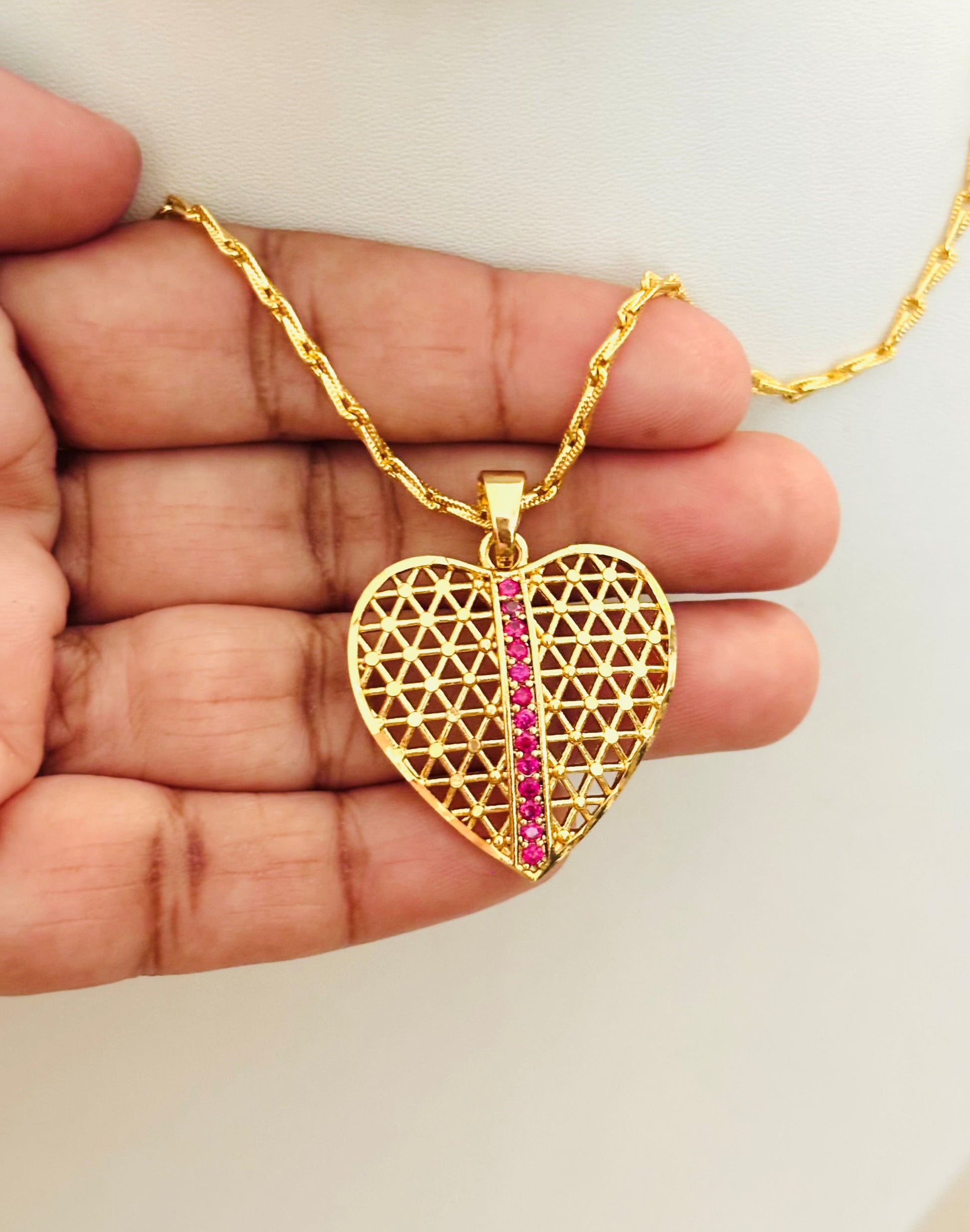 Fall in love with the intricate details of this beautiful gold-plated necklace, featuring a filigree heart pendant highlighted by a striking vertical stripe of pink ruby stones, all finished with a skin-friendly, allergy-free gold plating. Total length 24 inches..