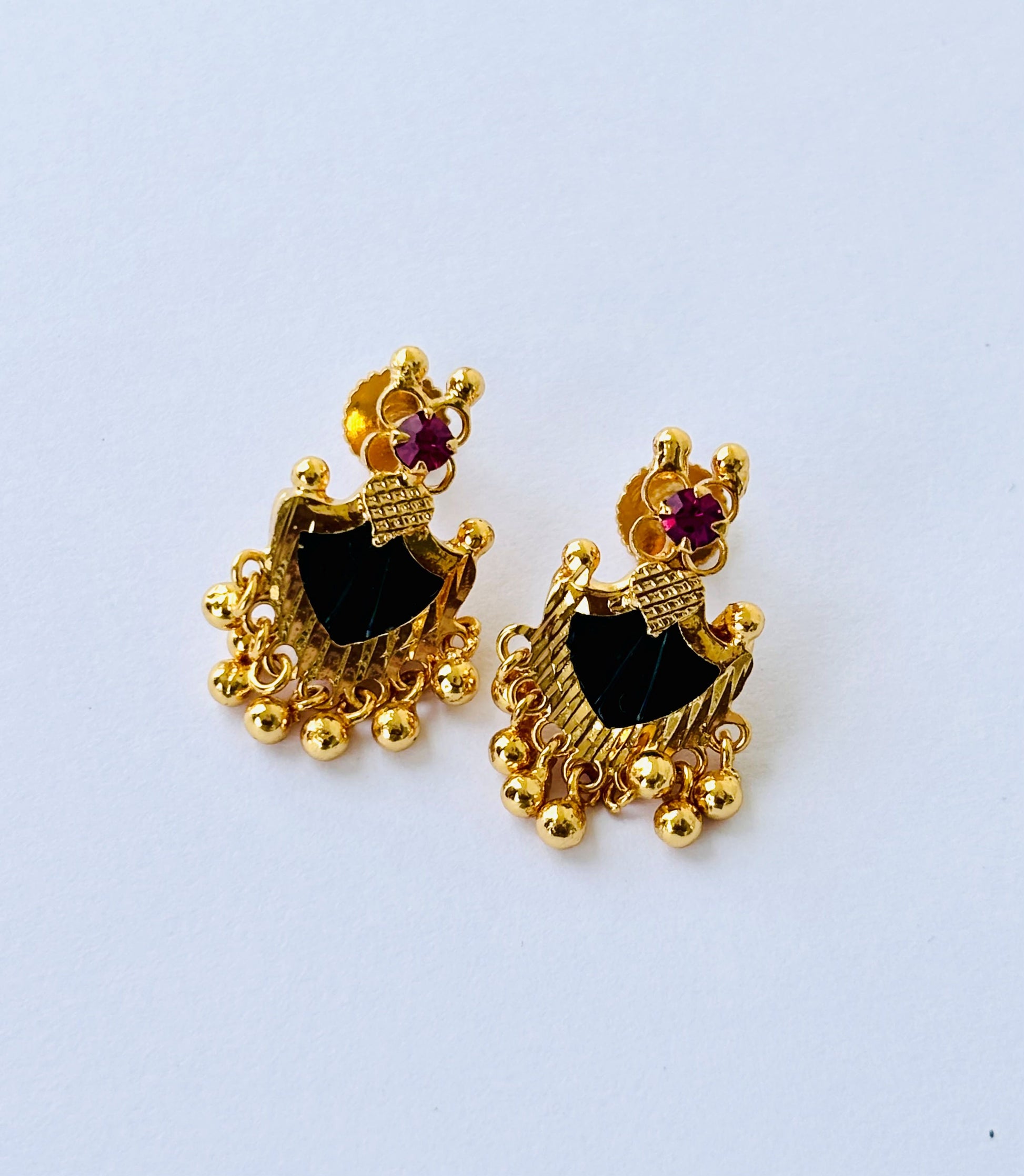 Adorn your ears with the timeless charm of traditional South Indian jewellery with these exquisite gold-plated Palakka earrings, featuring green and ruby stones.