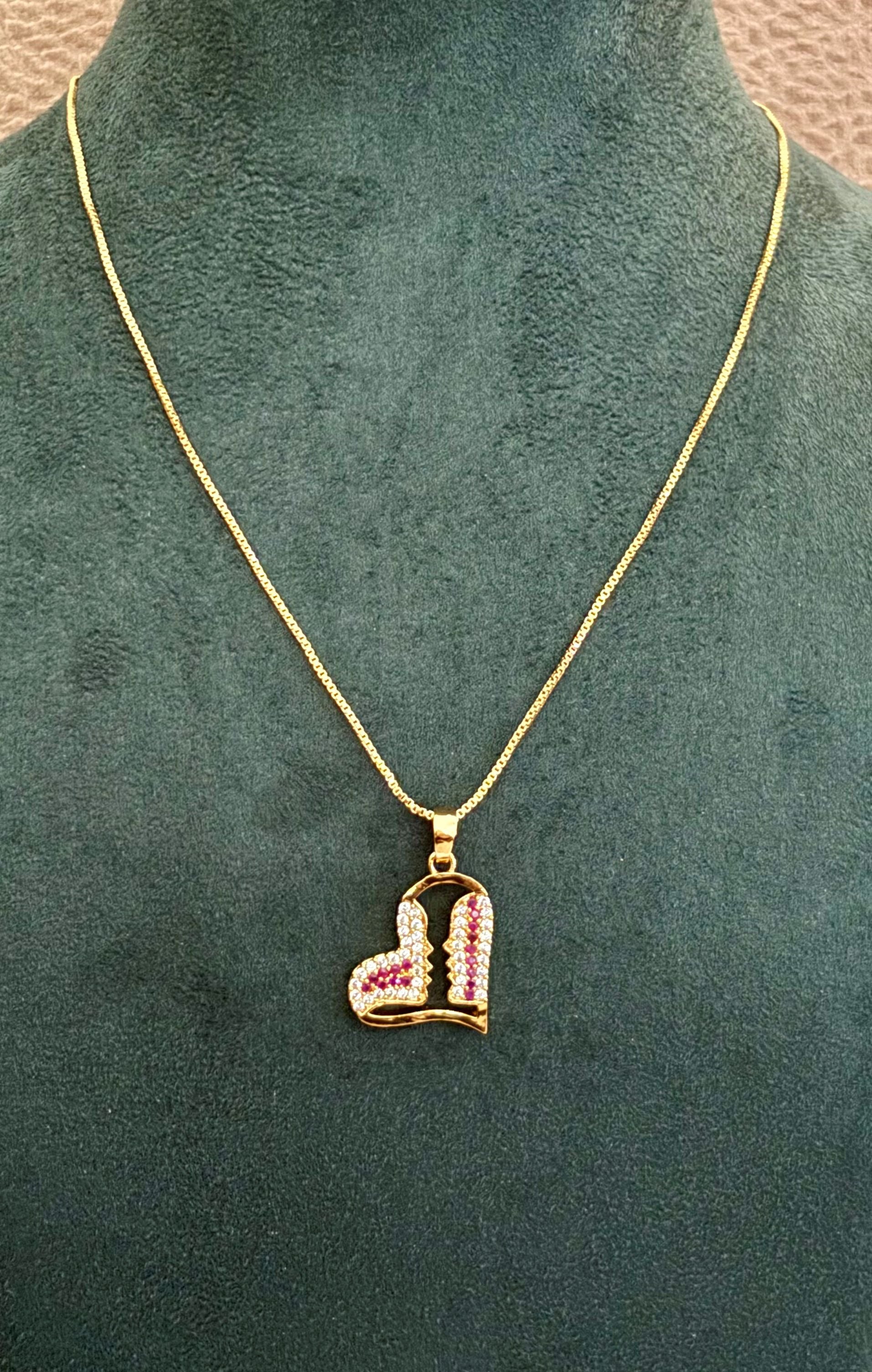 Capture her heart with this modern and stylish gold-plated necklace, featuring a unique heart pendant sparkling with brilliant pink and white American Diamond stones, all finished with a skin-friendly, allergy-free gold plating. Total length of chain 17 inches. Pendant length 1.25 inches.