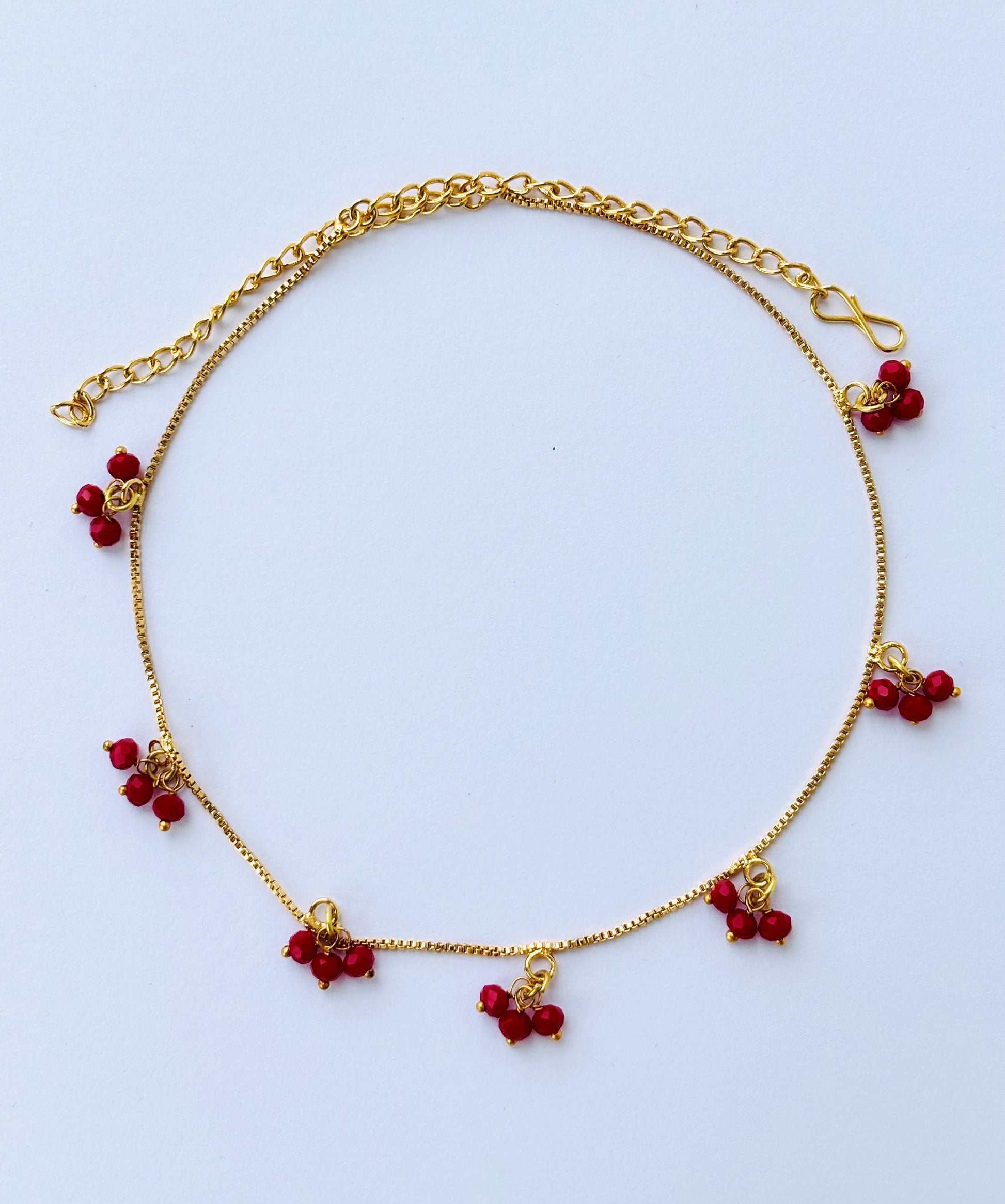 Add a charming pop of color to any outfit with this delicate gold-plated necklace, featuring dangling clusters of vibrant red crystal beads and an allergy-free finish. Length 11 inches (plus adjustment chain 6 inches). Total length 17 inches.