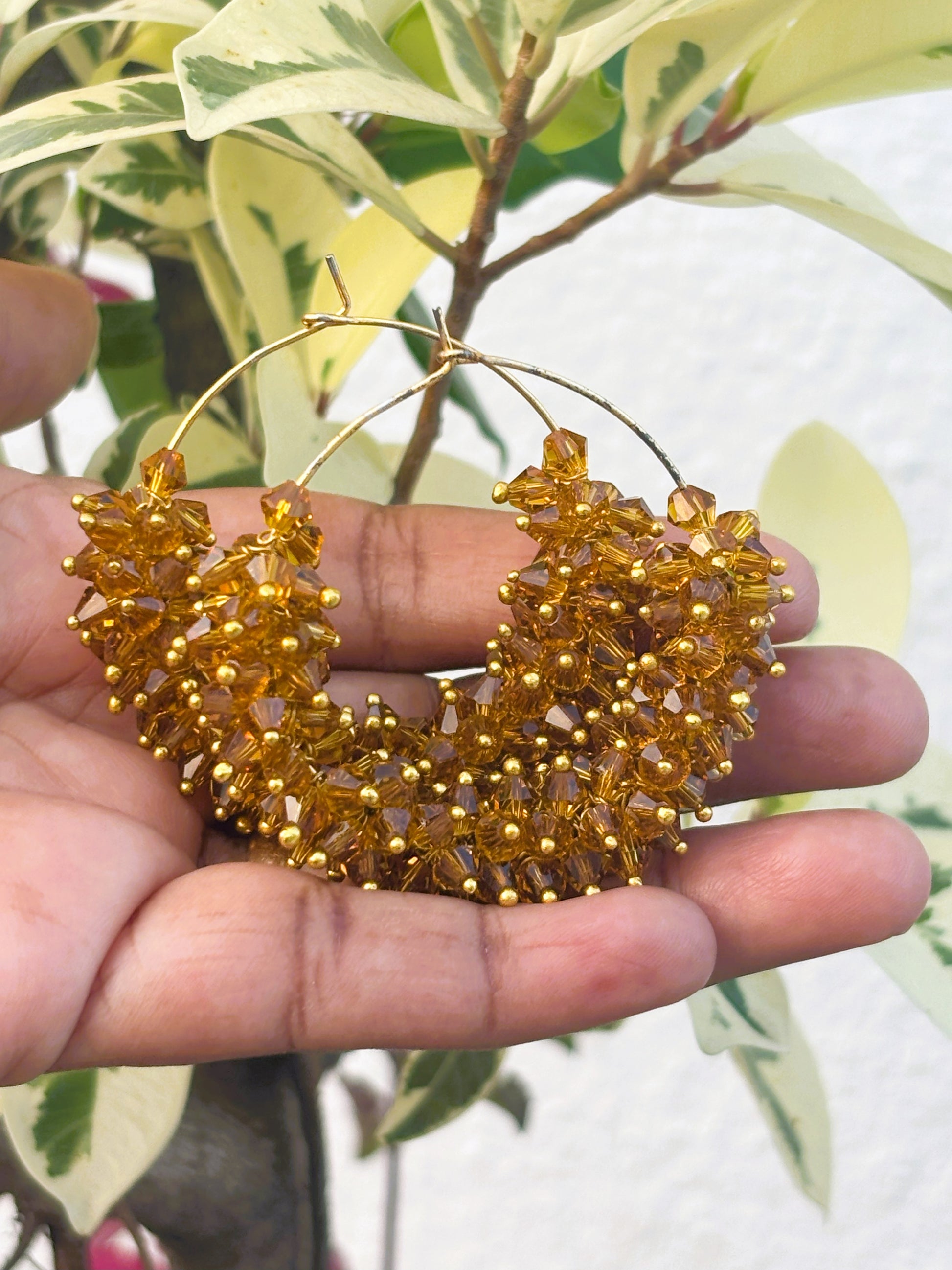 These stunning handmade gold hoop earrings feature a rich cluster of sparkling faceted amber beads, perfect for a glamorous statement. Sold as a single pair.