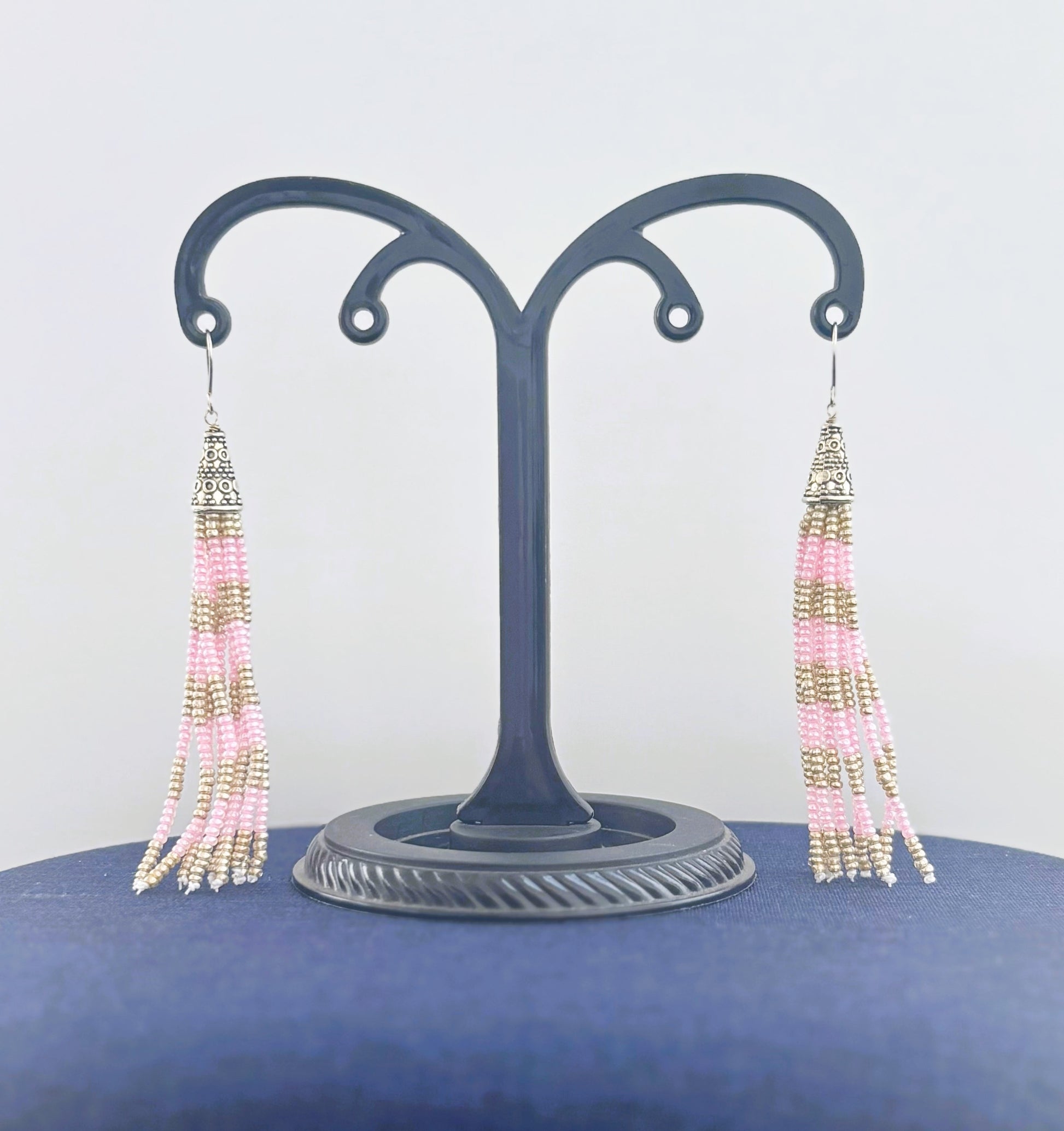 Handmade Baby Pink and Silver Beaded Tassel Earrings