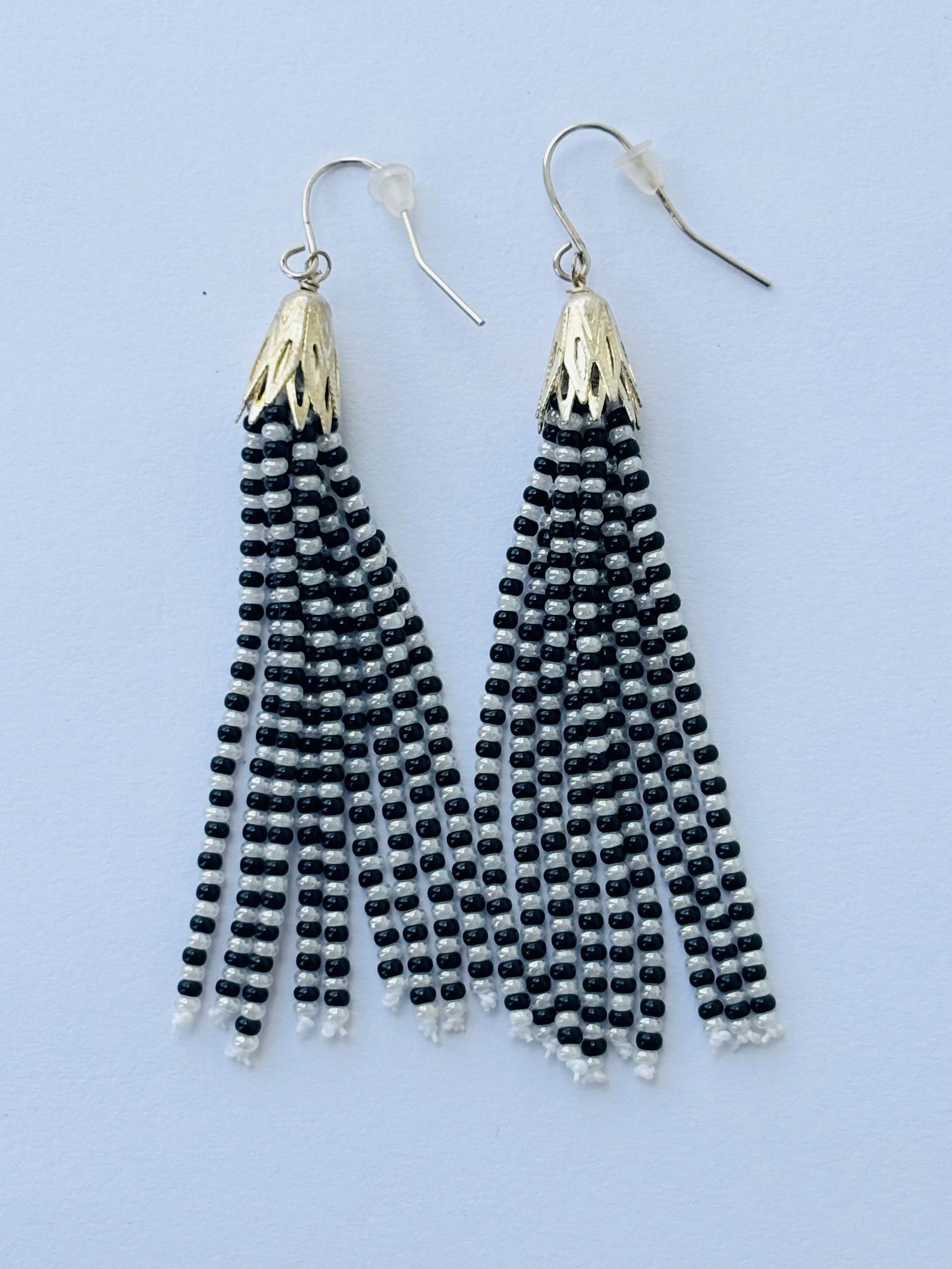 Striking handmade tassel earrings featuring a bold pattern of black and white Perciosa beads and decorative silver caps. Sold as a single pair.
