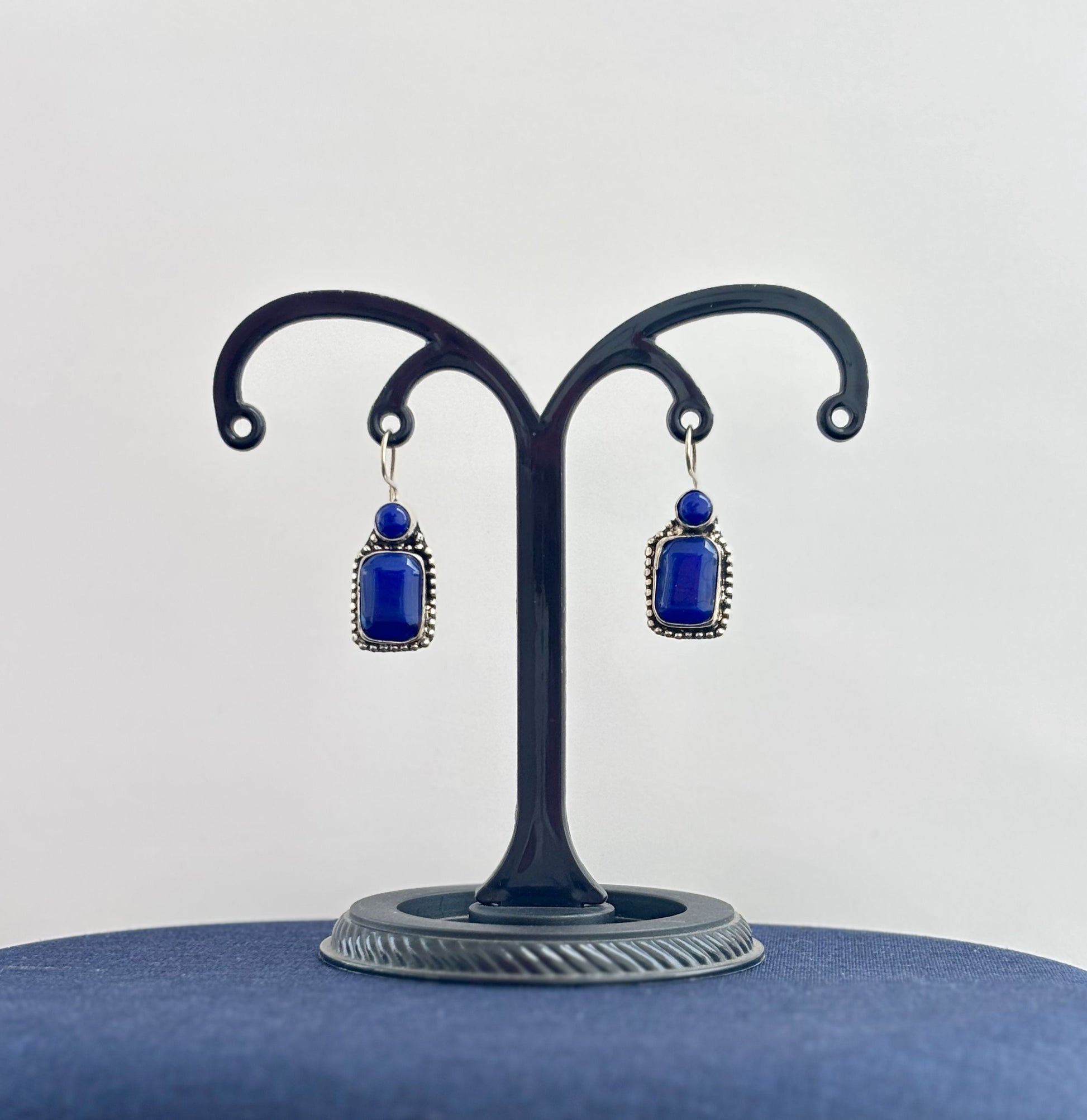 A stunning pair of handmade dangle earrings featuring vibrant blue stones set in a textured oxidized silver design. Sold as a single pair.