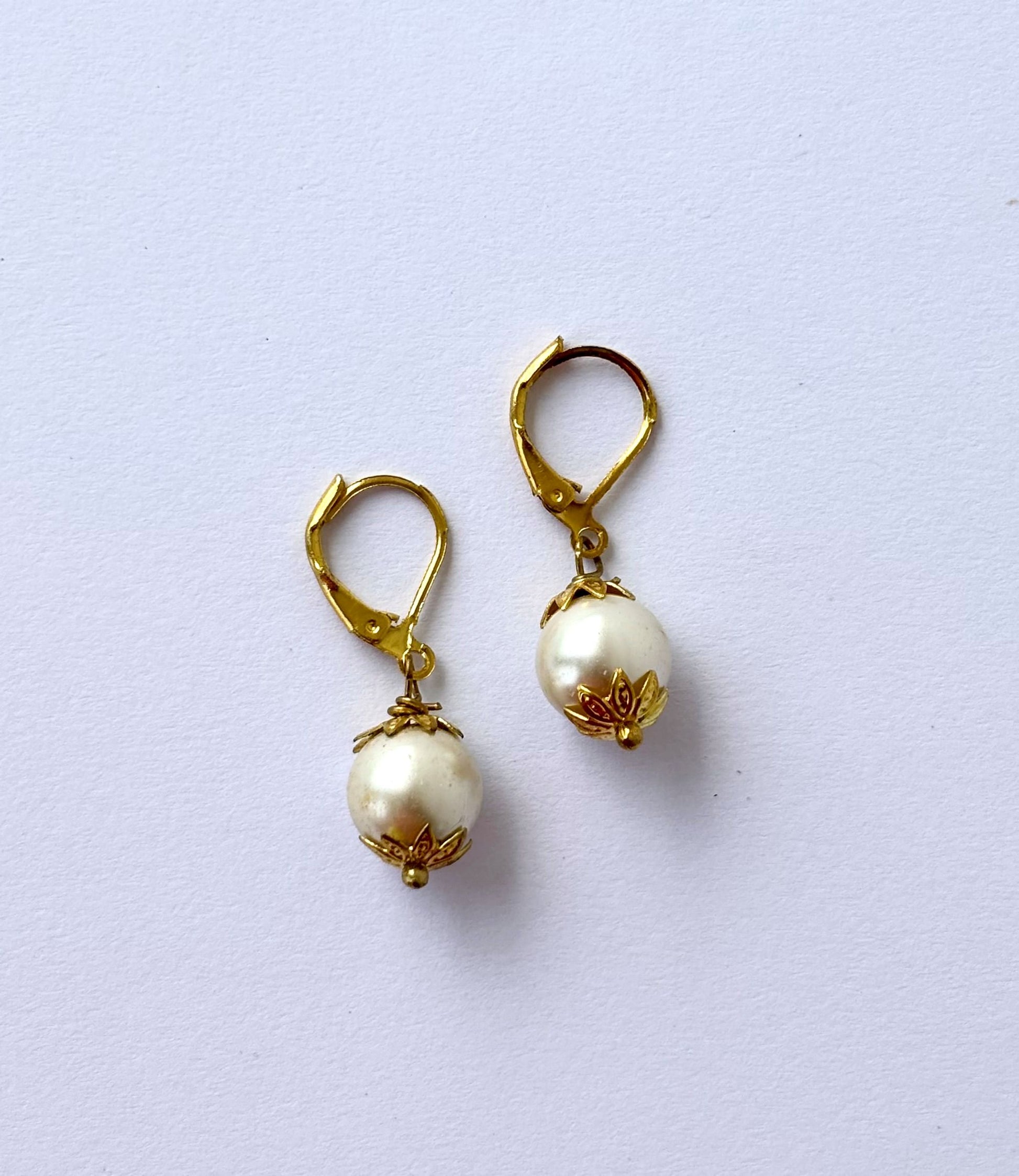 Ornate oxidized gold-tone earrings with a floral stud featuring a red glitter accent and a classic white pearl drop. Sold as a single pair.