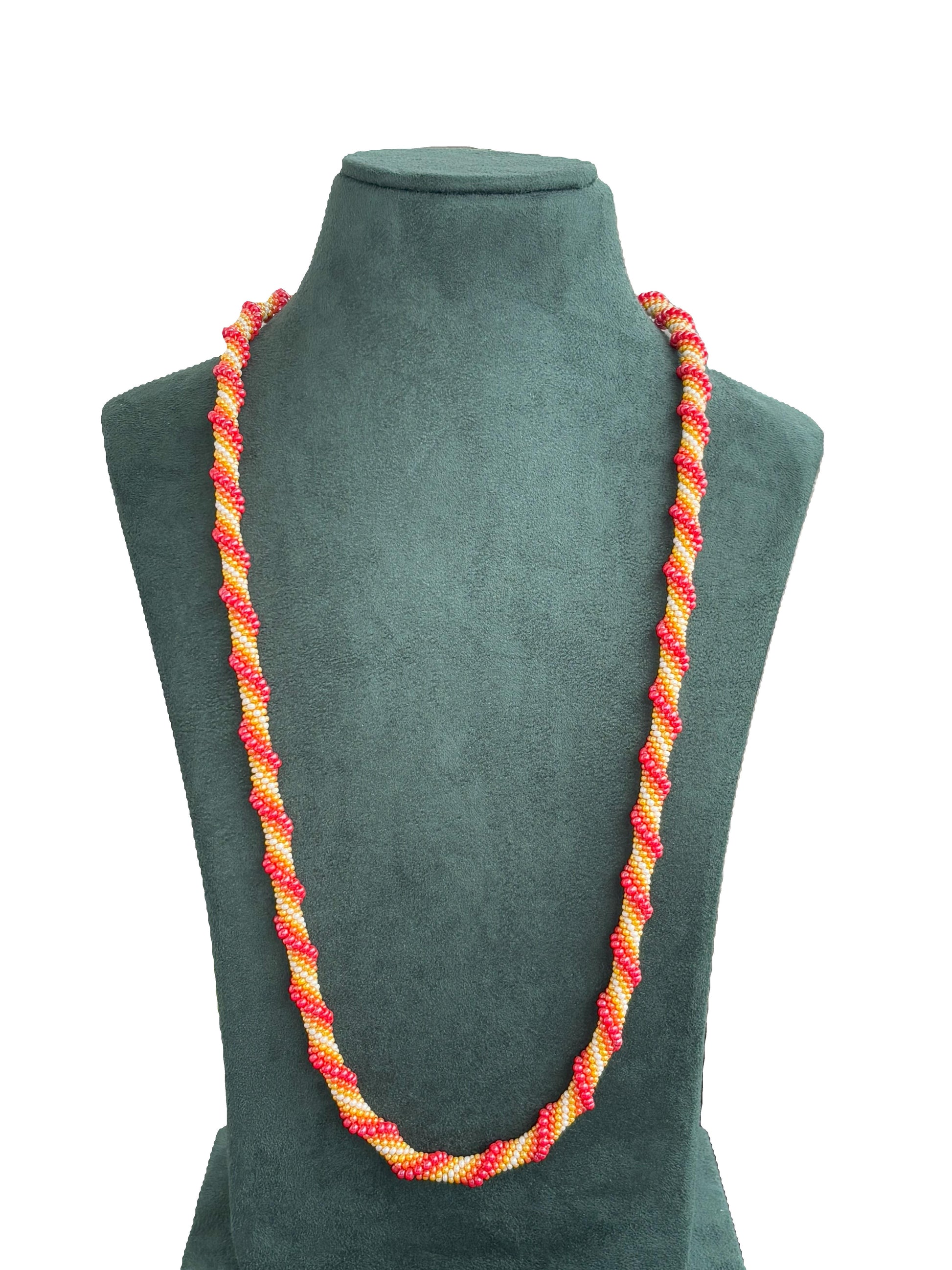 A vibrant handmade crochet necklace crafted from Preciosa beads in a striking striped pattern of red, orange, and yellow. Sold as a single piece. Length 28 inches in total.