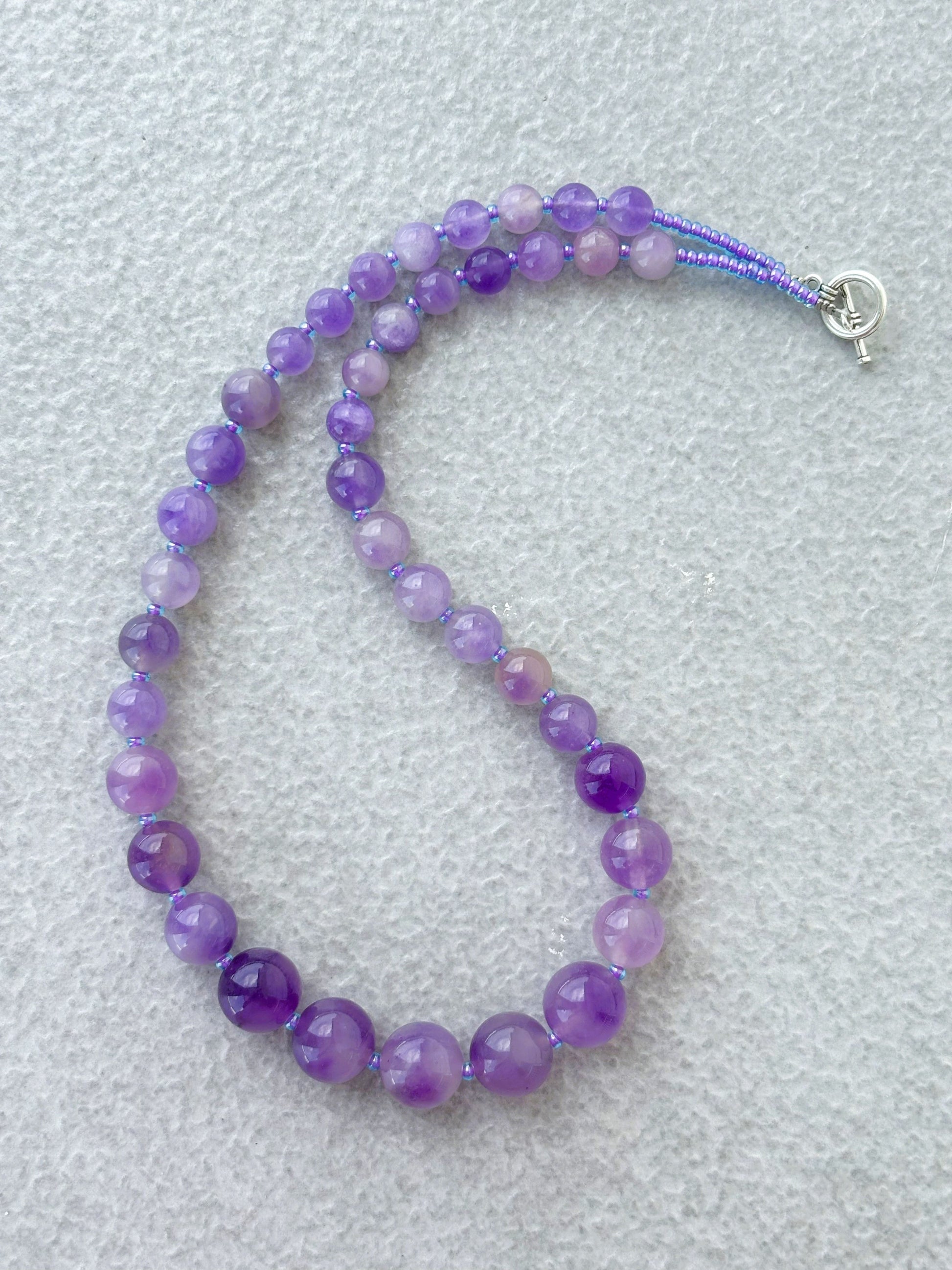 This stunning handmade necklace features graduated amethyst gemstones, creating a beautiful and serene accessory perfect for any occasion. Sold as a single piece. Length 21 inches in total.
