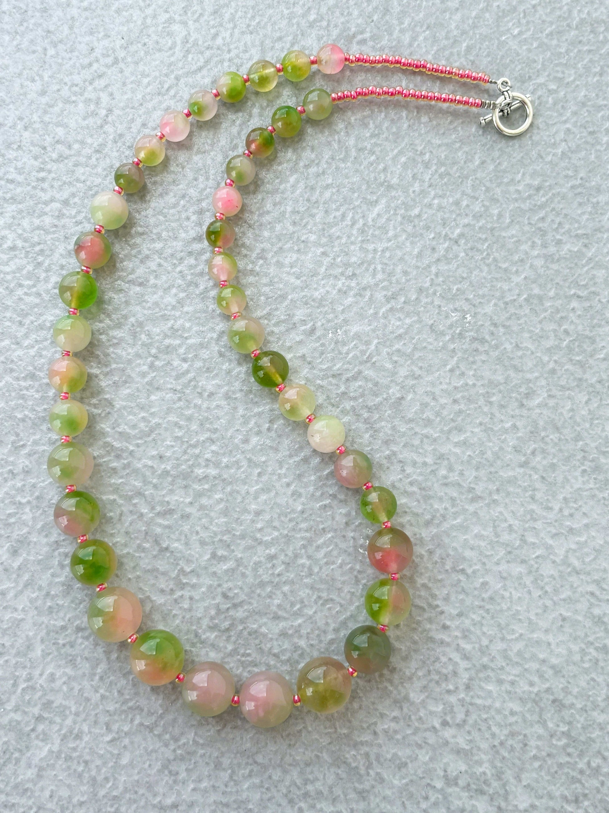 This stunning handmade necklace features graduated light green and pink agate gemstones, creating a beautiful and unique accessory for any occasion. Sold as a single piece. Length 21 inches in total.