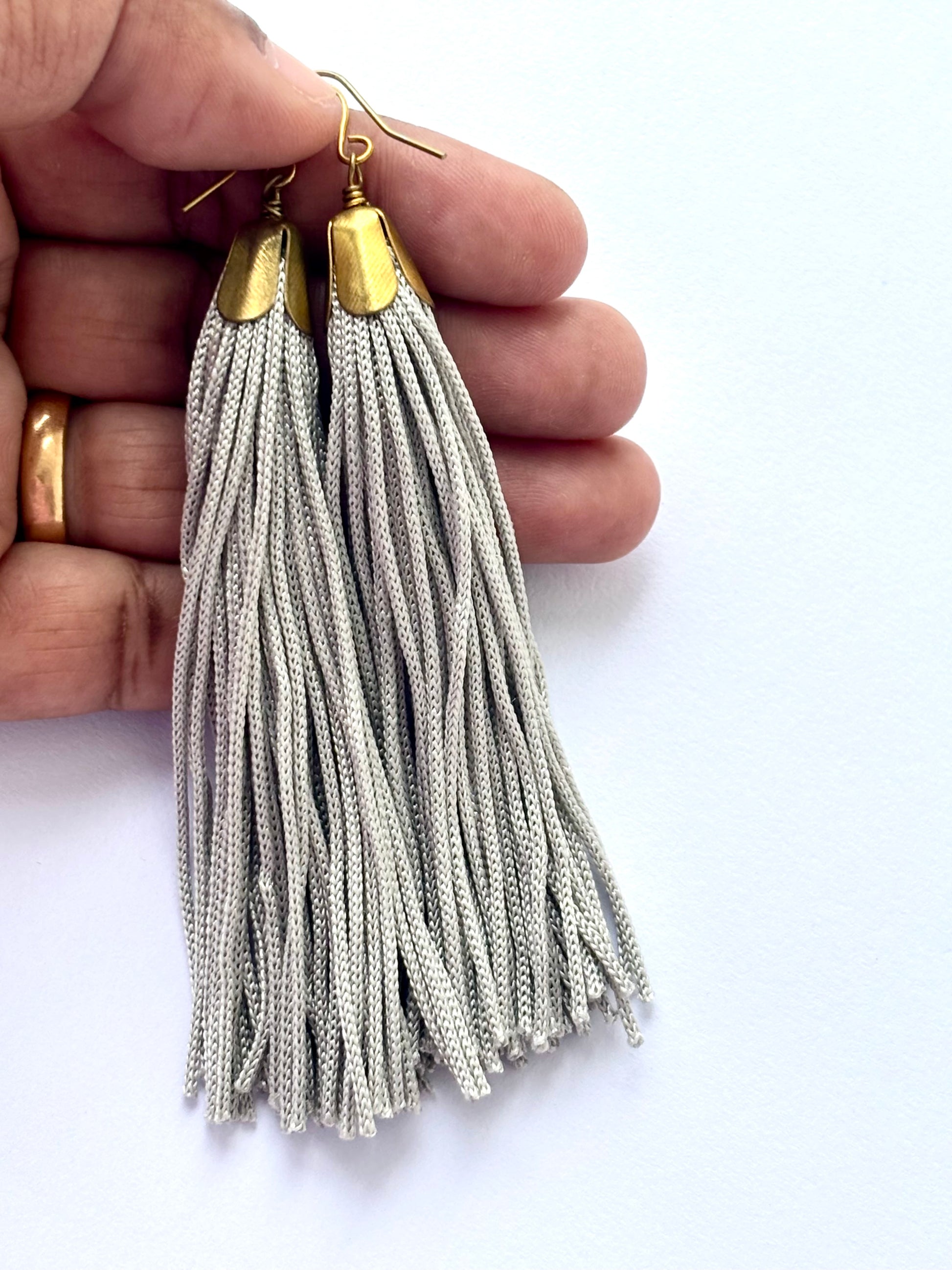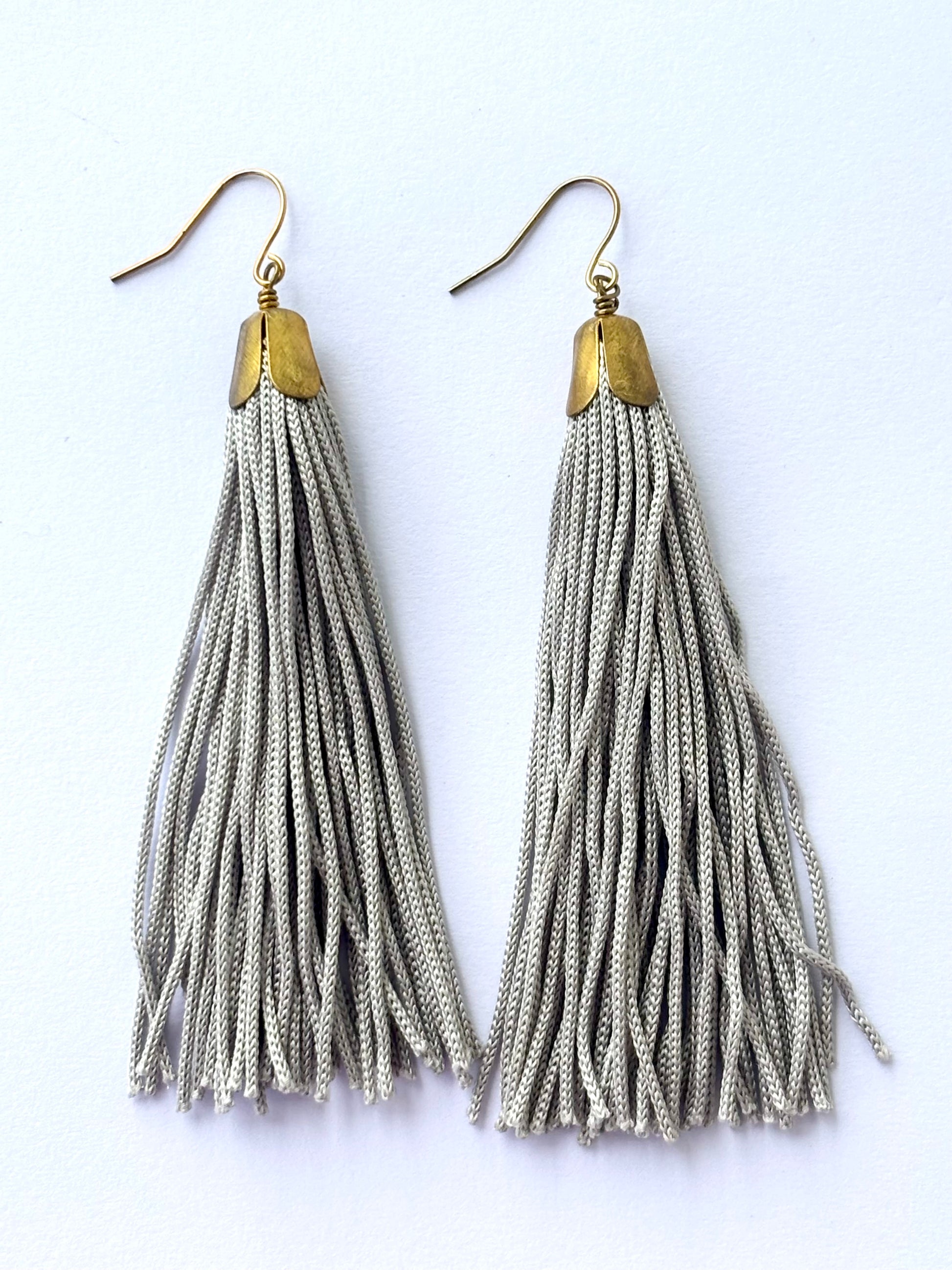 These elegant handmade dangle earrings feature a soft gray silk tassel and a gold-toned cap, creating a sophisticated yet bohemian look. Sold as a single pair.