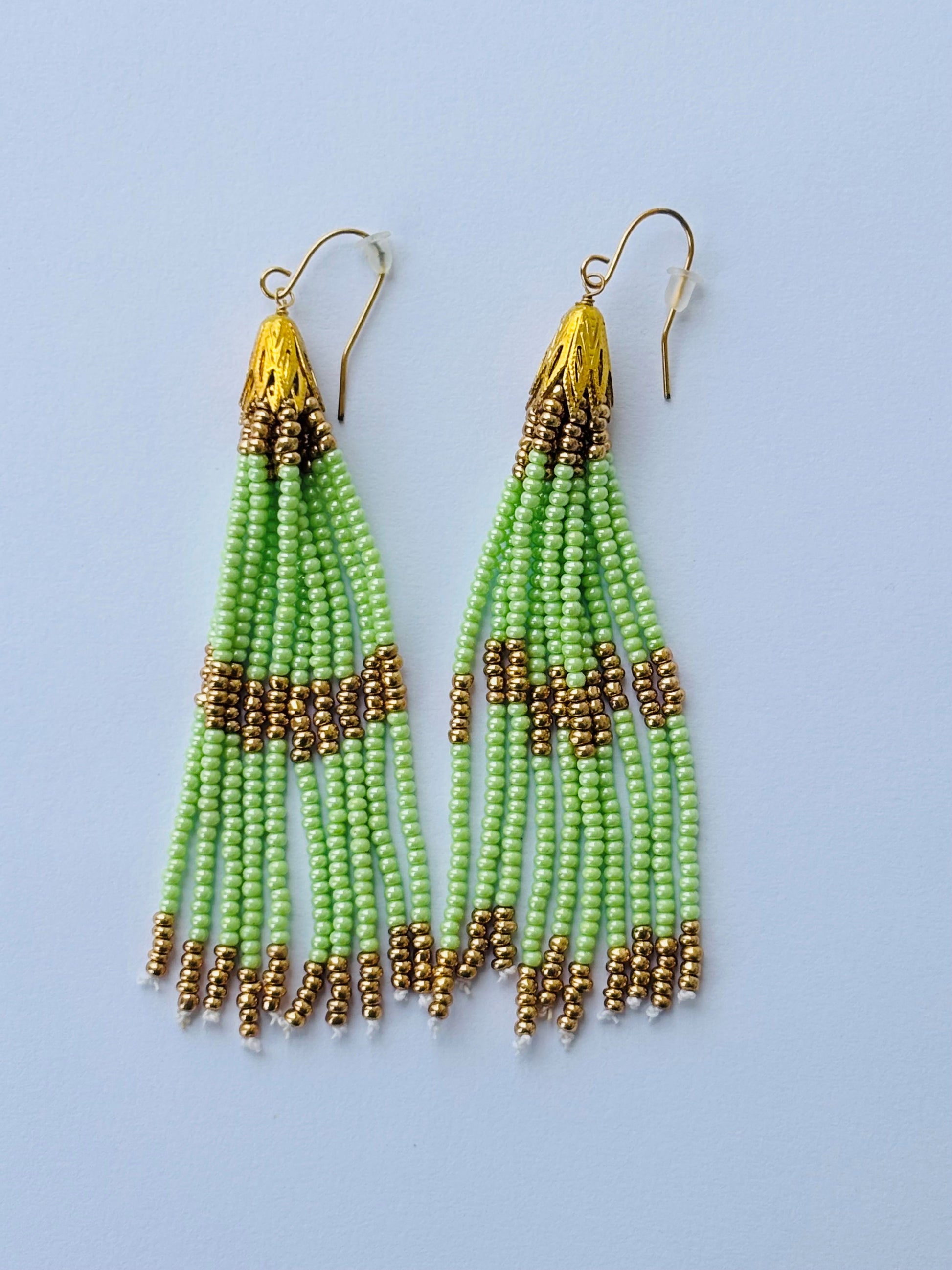Elegant handmade tassel earrings featuring a delicate pattern of light green and gold Perciosa beads with decorative gold caps. Sold as a single pair.