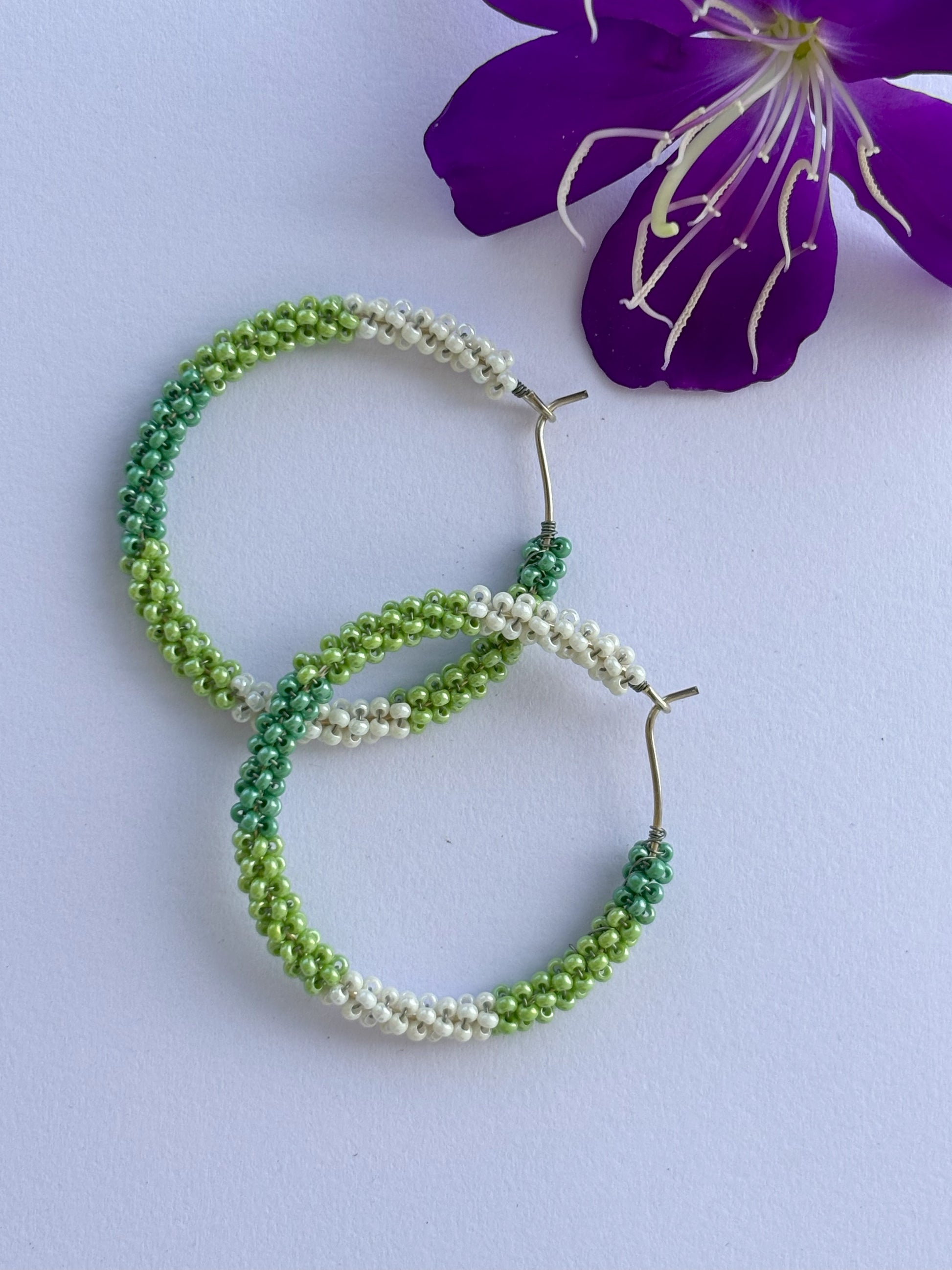 Handmade Green and White Seed Bead Hoops